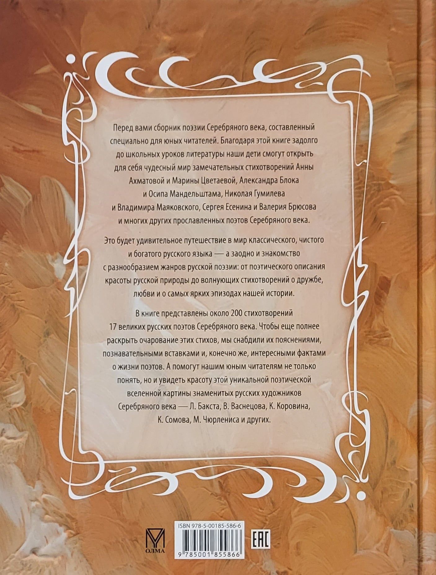 В книге представлены около 200 стихотворений 17 великих русских поэтов Серебряного века. Чтобы еще полнее раскрыть очарование этих стихов, мы снабдили их пояснениями, познавательными вставками и, конечно же, интересными фактами о жизни поэтов. А помогут нашим юным читателям не только понять, но и увидеть красоту этой уникальной поэтической вселенной картины знаменитых русских художников Серебряного века – Л. Бакста, В. Васнецова, К. Коровина, К. Сомова, М. Чюрлениса и других.
