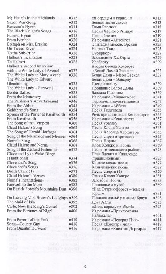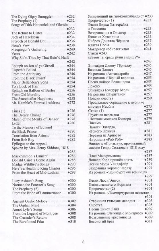 Лучшие из стихов Скотта отличают сюжетность, яркость образов, отточенная форма. Поэт выражает в них любовь к суровой шотландской природе, уважение к труженикам, восхищение героями родного края. Подробные примечания помогают лучше понять особенности и дух далекой от нас эпохи.