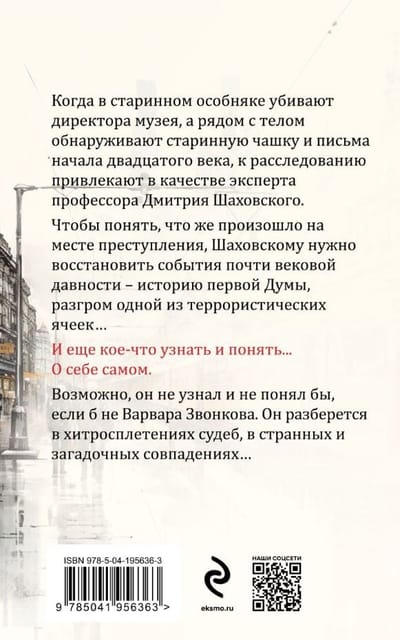 Когда в старинном особняке убивают директора музея, а рядом с телом обнаруживают старинную чашку и письма начала двадцатого века, к расследованию привлекают в качестве эксперта профессора Дмитрия Шаховского. Чтобы понять, что же произошло на месте преступления, Шаховскому нужно восстановить события почти вековой давности — историю первой Думы, разгром одной из террористических ячеек… И еще кое-что узнать и понять... о себе самом. Возможно, он не узнал и не понял бы, если б не Варвара Звонкова. Он разберется в хитросплетениях судеб, в странных и загадочных совпадениях…