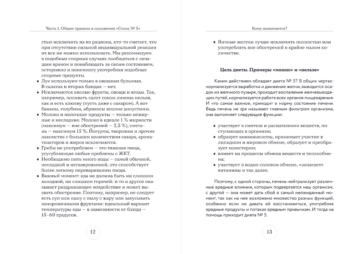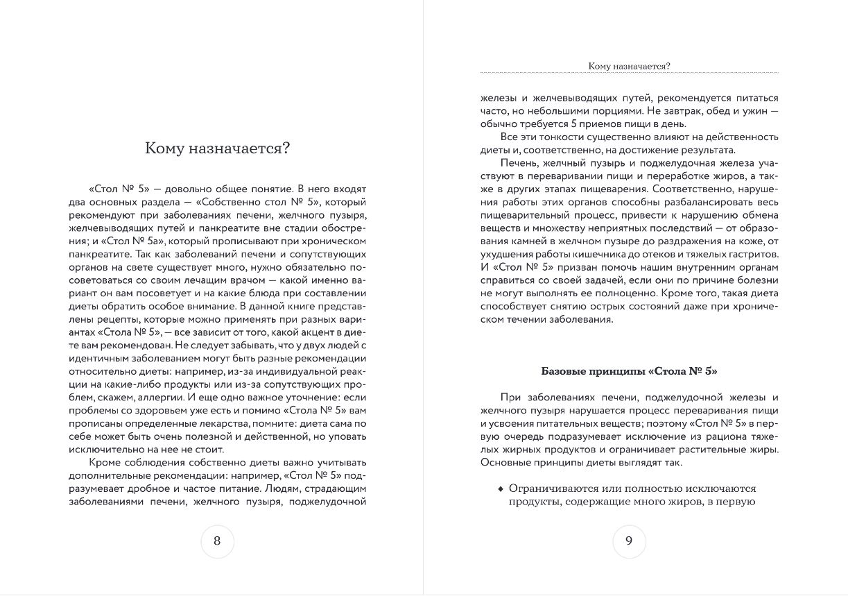 Что важно для всех читающих эту книгу. «Стол № 5» — довольно общее понятие. В него входят два основных раздела — «собственно стол № 5», который рекомендуют при заболеваниях печени, желчного пузыря, желчевыводящих путей и панкреатите вне стадии обострения, и «стол № 5а», который прописывают при хроническом панкреатите. Так как заболеваний печени и сопутствующих органов на свете существует много, нужно обязательно посоветоваться со своим лечащим врачом — какой именно вариант он вам посоветует и на какие блюда при составлении диеты обратить особое внимание. В этой книге вы найдете список продуктов, которые можно и которые нельзя употреблять при определенных заболеваниях, рекомендации по их обработке и нарезке. «Стол № 5» подразумевает частое питание небольшими порциями. Обычно назначают 5 приемов пищи в день, из которых два или три могут состоять только из одного блюда. Поэтому в книге дано меню на 4 недели, созданное из блюд, представленных в ней. А также приведена таблица по КБЖУ каждого важного продукта. И, конечно, рецепты, их более ста. Надеемся, книга станет полезным помощником тем людям, у которых уже есть проблемы со здоровьем, а также тем, кто хочет оставаться здоровым как можно дольше.