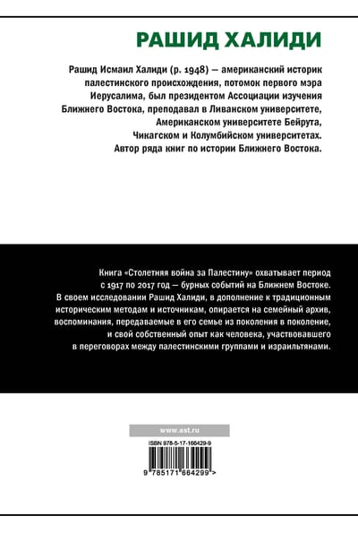 Книга «Столетняя война за Палестину» охватывает период с 1917 по 2017 год - бурных событий на Ближнем Востоке. В своем исследовании Рашид Халиди, в дополнение к традиционным историческим методам и источникам, опирается на семейный архив, воспоминания, передаваемые в его семье из поколения в поколение, и свой собственный опыт как человека, участвовавшего в переговорах между палестинскими группами и израильтянами.