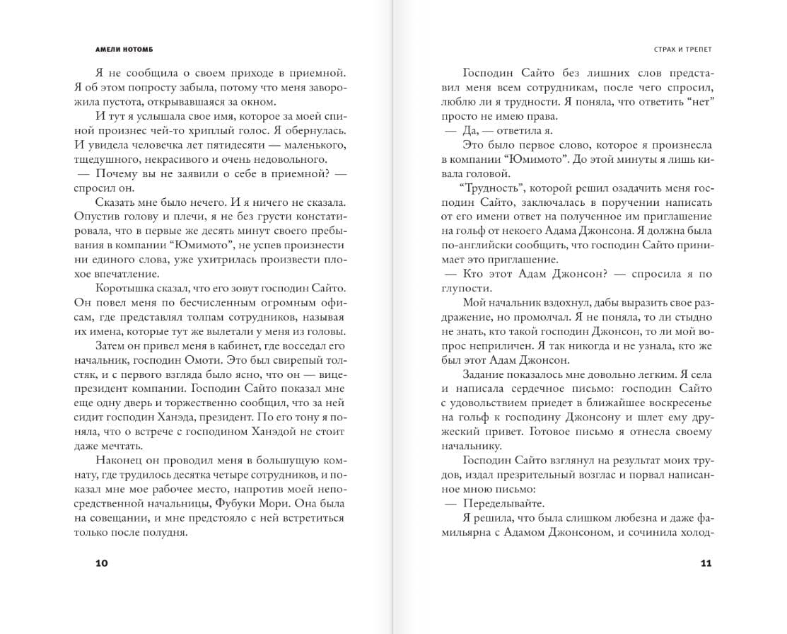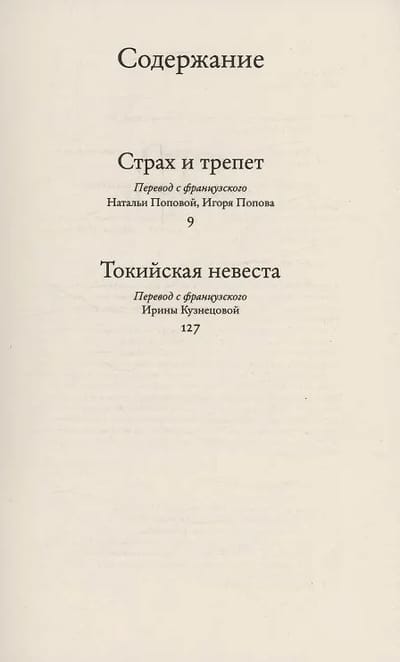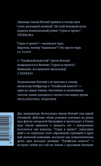 «Страх и трепет» — увлекательнейший и остроумный роман о ее попытках стать образцовой служащей в крупной японской компании. Выстроенный как психологическая дуэль двух красивых женщин, он принес молодой писательнице Гран-при Французской академии. «Токийская невеста» — история любви все той же Амели с красавцем японцем, едва не увенчавшаяся свадьбой. Оба романа успешно экранизированы.