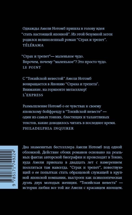 Романы «Страх и трепет» и «Токийская невеста» — самые знаменитые ее бестселлеры. Обе книги основаны на реальных фактах авторской биографии. Дочь крупного бельгийского дипломата, Амели Нотомб провела раннее детство в Японии и так полюбила эту страну, что мечтала, когда вырастет, вернуться туда и стать