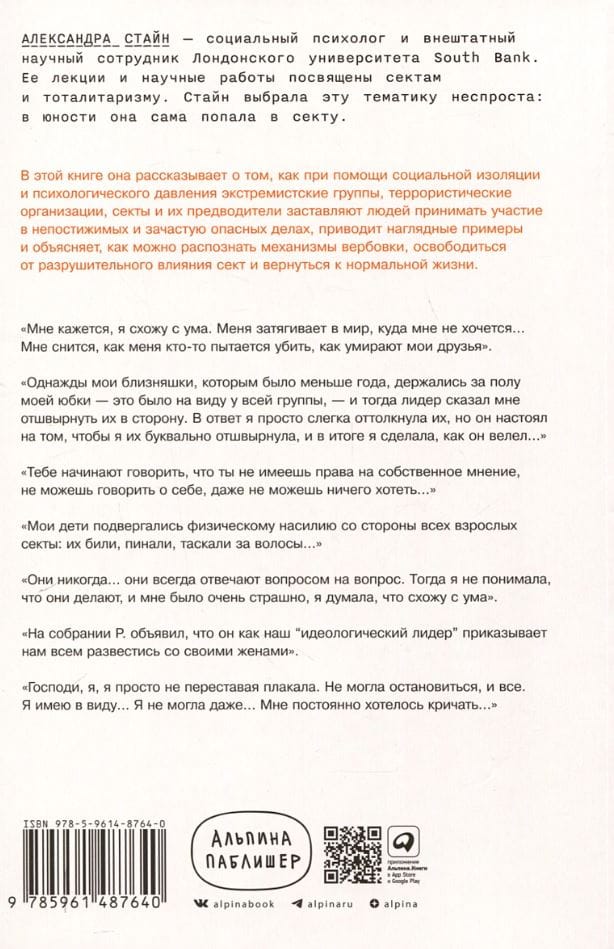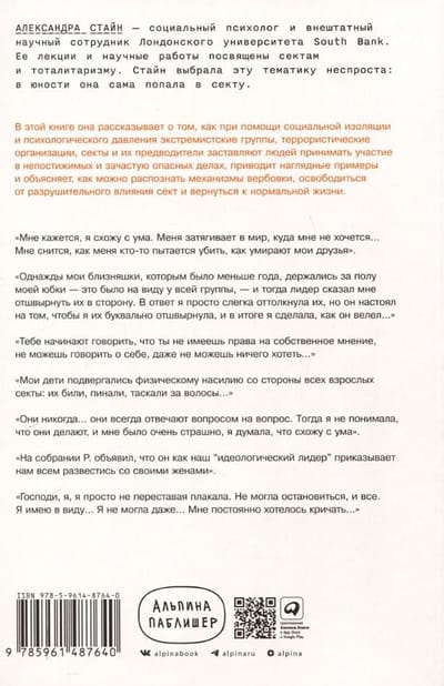Социальный психолог Александра Стайн 10 лет провела в секте, но смогла освободиться от ее влияния и стала одним из ведущих специалистов в мире по механизмам влияния деструктивных сообществ. В ее книге, ставшей итогом многолетнего исследования, описываются механизмы привязанности, с помощью которых секты и тоталитарные режимы контролируют сознание людей.