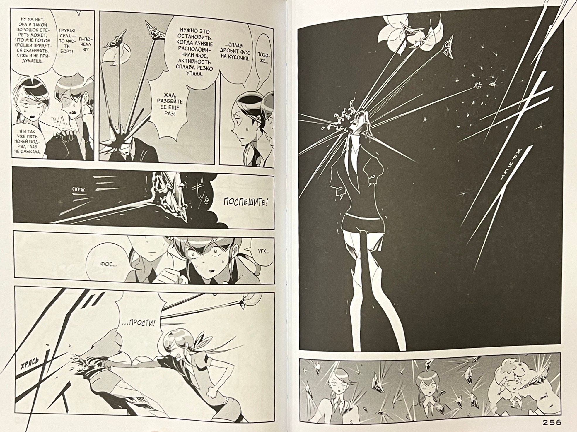 Далекое будущее. Бессмертные драгоценности продолжают воевать с лунянами. Фосфофиллит замечает некоторые странности в поведении учителя Конго и начинает подозревать его в связи с лунянами. Она в одиночку пытается найти способ поговорить с ними, чтобы раскрыть тайну учителя…