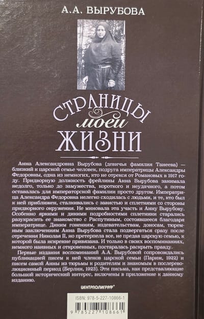 Анна Александровна Вырубова (девичья фамилия Танеева) — близкий к царской семье человек, подруга императрицы Александры Федоровны, одна из немногих, кто не отрекся от Романовых в 1917 году. Придворную должность фрейлины Анна Вырубова занимала недолго, только до замужества, короткого и неудачного, а потом оставалась для императорской фамилии просто другом. Императрица Александра Федоровна нелегко сходилась с людьми, и те, кто был к ней приближен, сталкивались с завистью и сплетнями со стороны придворного окружения. Не миновала эта участь и Анну Вырубову. Особенно яркими и дикими подробностями сплетники старались разукрасить ее знакомство с Распутиным, состоявшееся благодаря императрице. Диким гонениям, издевательствам, доносам, тюремным заключениям Анна Вырубова стала подвергаться сразу после отречения Николая II, но претерпела все, не предав царскую семью, к которой была искренне привязана. И только в своих воспоминаниях, немного наивных и откровенных, постаралась раскрыть правду.