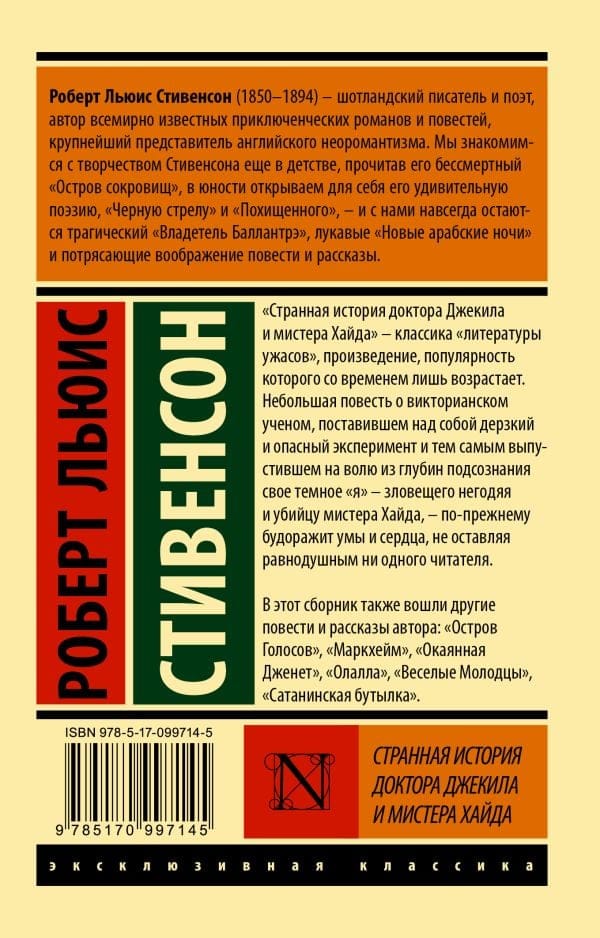 "Странная история доктора Джекила и мистера Хайда" – классика "литературы ужасов", произведение, популярность которого со временем лишь возрастает. Небольшая повесть о викторианском ученом, поставившем над собой дерзкий и опасный эксперимент и тем самым выпустившем на волю из глубин подсознания свое темное "я" – зловещего негодяя и убийцу мистера Хайда, – по-прежнему будоражит умы и сердца, не оставляя равнодушным ни одного читателя.
