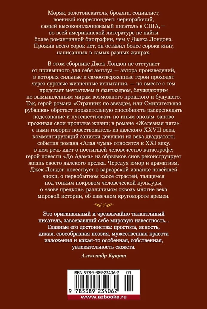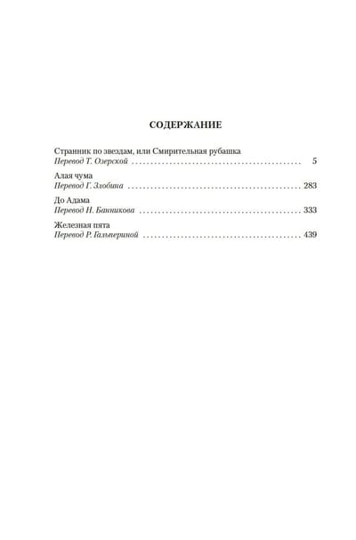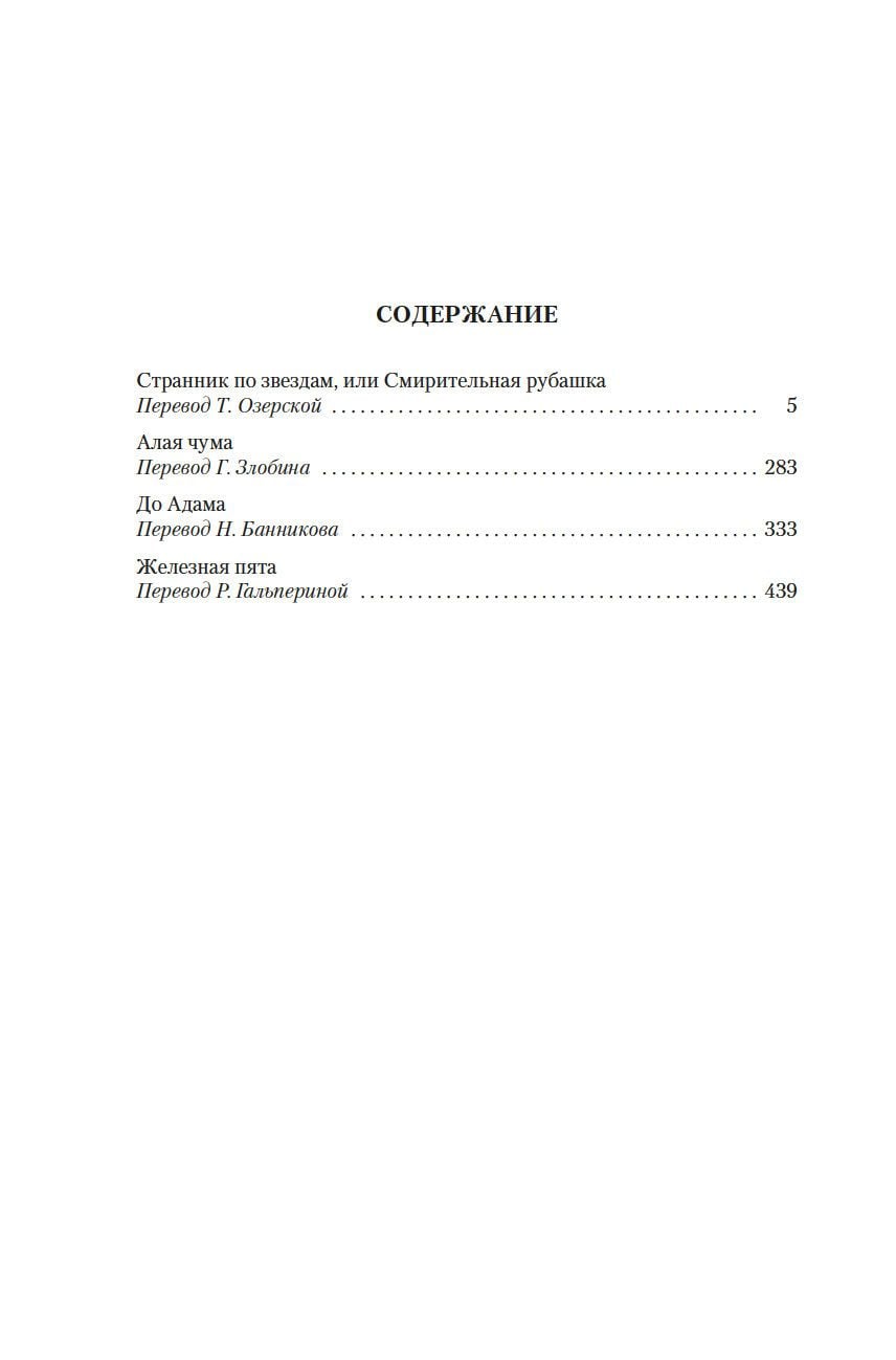 Моряк, золотоискатель, бродяга, социалист, военный корреспондент, чернорабочий, самый высокооплачиваемый писатель в США, — во всей американской литературе не найти более романтичной биографии, чем у Джека Лондона. Прожив всего сорок лет, он оставил более сорока книг, написанных в самых разных жанрах. В этом сборнике Джек Лондон не отступает от привычного для себя амплуа — автора произведений, в которых сильные и самоотверженные герои проходят через суровые жизненные испытания, — но вместе с тем предстает мечтателем и фантазером, блуждающим по вымышленным мирам возможного прошлого и будущего. Так, герой романа «Странник по звездам, или Смирительная рубашка» обретает поразительную способность раскрепощать подсознание и путешествовать по иным эпохам, заново проживая свои прошлые жизни; в романе «Железная пята» с нами говорит повествователь из далекого XXVII века, комментирующий записки девушки из века двадцатого; события романа «Алая чума» относятся к XXI веку, в нем речь идет о постигшей человечество катастрофе; герой повести «До Адама» из обрывков снов реконструирует жизнь своего далекого предка. Чередуя юмор и драматизм, Джек Лондон повествует о варварской изнанке новейшей эпохи, о первобытном хаосе страстей, таящемся под тонким покровом человеческой культуры, о «зове предков», различимом сквозь многие века мировой истории, об извечном круговороте времен.