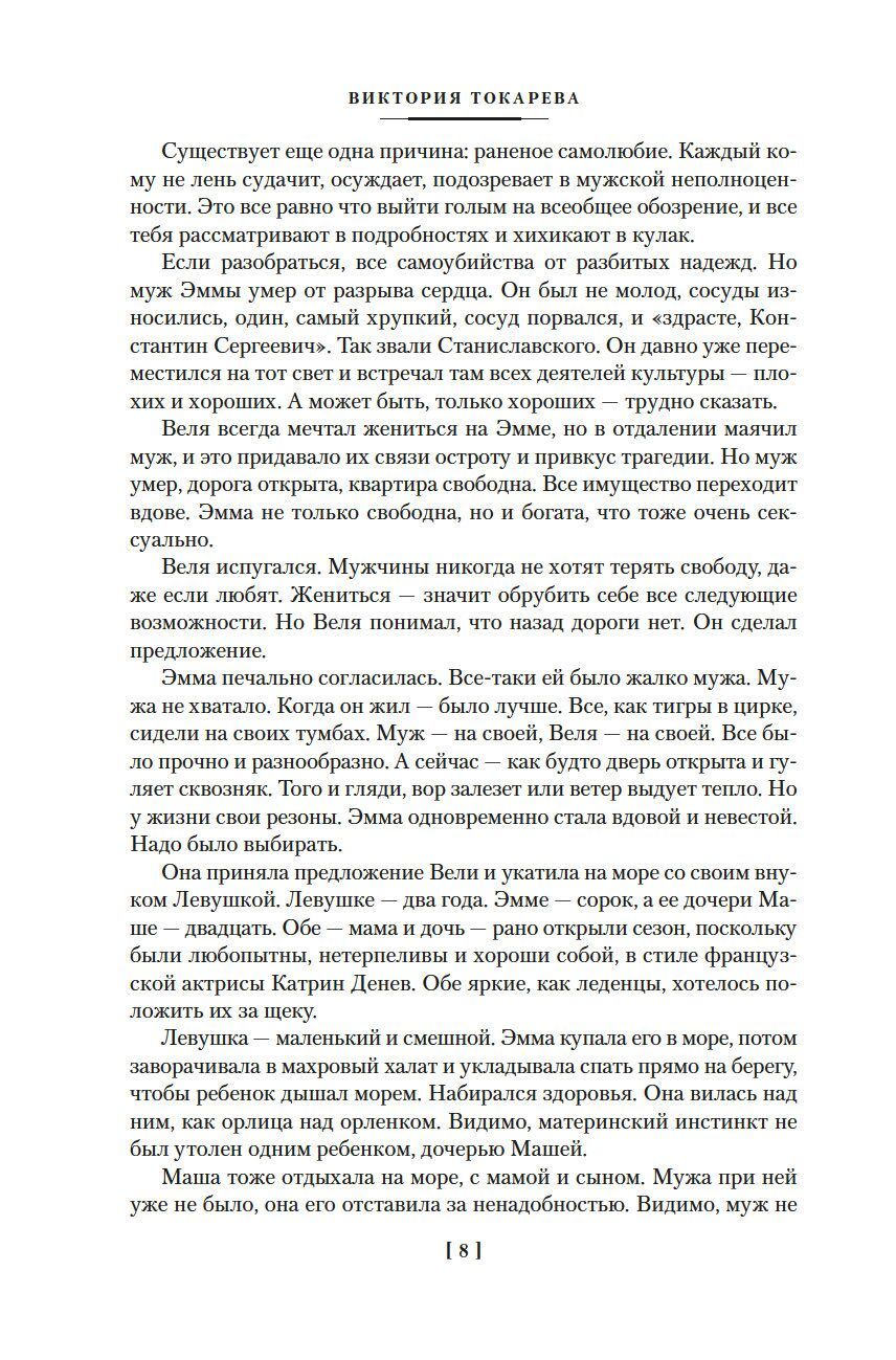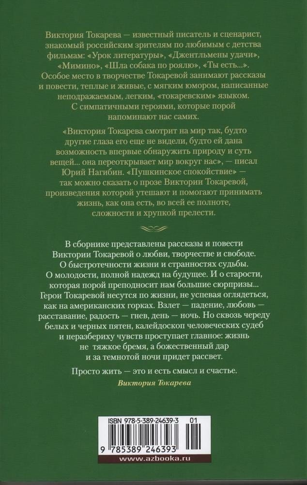 Виктория Токарева — известный писатель и сценарист, знакомый российским зрителям по любимым с детства фильмам: «Урок литературы», «Джентльмены удачи», «Мимино», «Шла собака по роялю», «Ты есть...». Особое место в творчестве Токаревой занимают рассказы и повести, теплые и живые, с мягким юмором, написанные неподражаемым, легким, «токаревским» языком. С симпатичными героями, которые порой напоминают нас самих. «Виктория Токарева смотрит на мир так, будто другие глаза его еще не видели, будто ей дана возможность впервые обнаружить природу и суть вещей... она переоткрывает мир вокруг нас», — писал Юрий Нагибин. «Пушкинское спокойствие» — так можно сказать о прозе Виктории Токаревой, произведения которой утешают и помогают принимать жизнь, как она есть, во всей ее полноте, сложности и хрупкой прелести. В издание вошли прозаические произведения Виктории Токаревой, включая повести «Случайная связь», «Мои мужчины», «Дома стоят дольше, чем люди», рассказы «Муля, кого ты привез?», «Письмо», «Невезучая Фима», «Кругом один обман», «Сволочей тоже жалко» и др.