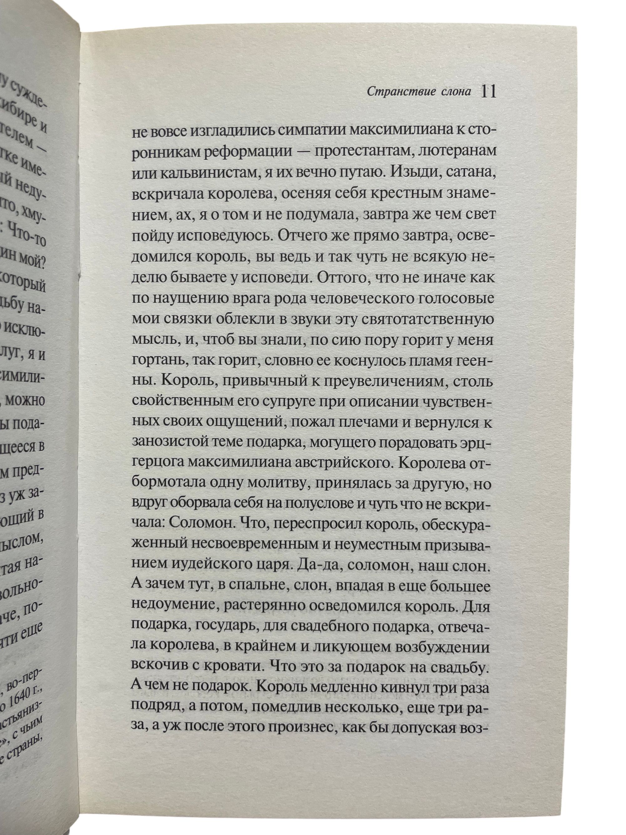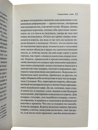 В этом романе король Португалии Жуан III Благочестивый преподносит эрцгерцогу Максимилиану, будущему императору Священной Римской империи, необычный свадебный подарок — слона по кличке Соломон. И вот со своим погонщиком Субхро слон отправляется в странствие по всей раздираемой религиозными войнами Европе, претерпевая в дороге массу приключений. Путь его лежит через Вальядолид и Геную, Верону и Венецию, через непроходимые альпийские перевалы, по живописной реке Инн — и наконец в имперскую столицу Вену, сердце державы Габсбургов.