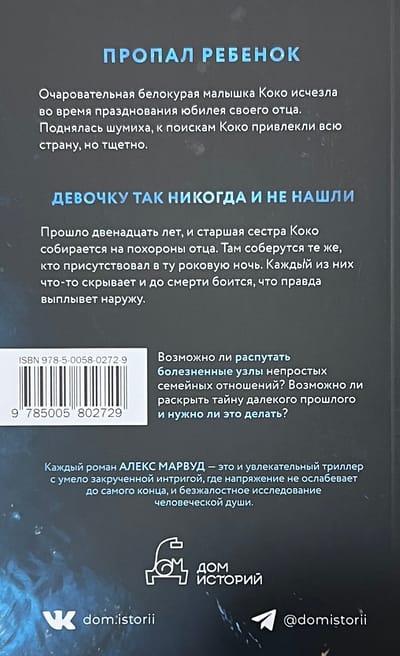 Пропал ребёнок. Очаровательная белокурая малышка Коко исчезла во время празднования юбилея своего отца. Поднялась шумиха, к поискам Коко привлекли всю страну, но тщетно – девочку так никогда и не нашла. Прошло двенадцать лет, и старшая сестра Коко собирается на похороны отца. Там соберутся те же, кто присутствовал в ту роковую ночь. Каждый из них что-то скрывает и до смерти боится, что правда выплывет наружу. Возможно ли распутать болезненные узлы непростых семейных отношений? Возможно ли раскрыть тайну далекого прошлого, и нужно ли это делать? Алекс Марвуд – мастерица психологического триллера – умеет держать читателя в напряжении до последней страницы.