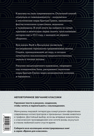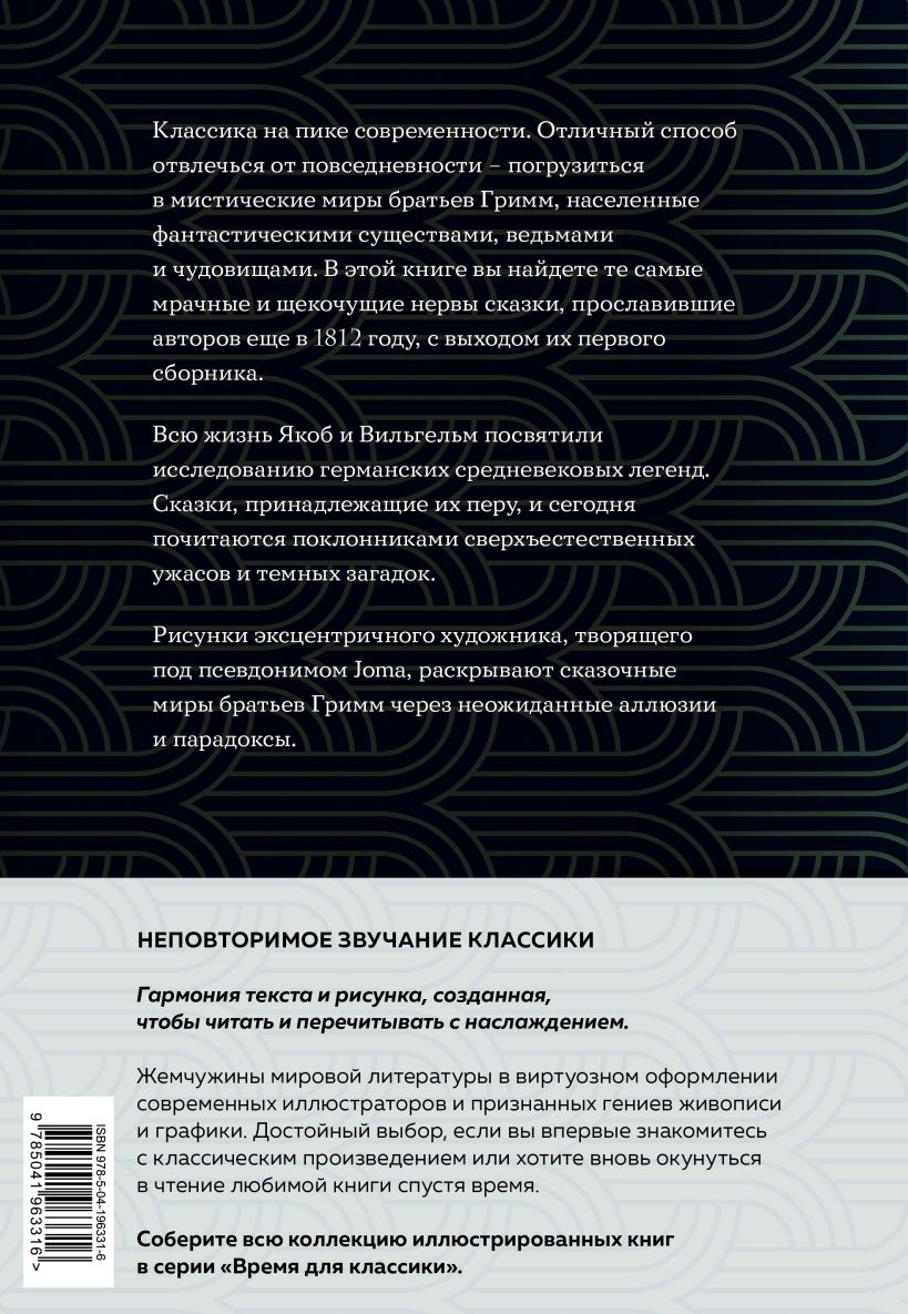 Издавна считается, что сказки — это не просто истории для детей, но настоящие притчи, которые учат быть осторожными и внимательными. Поэтому такие истории обязательно должны пугать. Мастера страшных сказок Братья Гримм умело переплетают магию и ужас в историях, собранных по крупицам из немецкого народного фольклора. Волшебные существа, зловещие леса и опасные приключения оживают на страницах книги, заставляя сердце биться чаще.