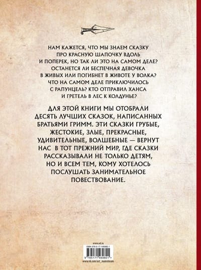 Сказки изменчивы, и такими они были всегда – начиная с древнейших времен, когда первые люди расселись вокруг костра и повели рассказ. Нам кажется, что мы знаем сказку про Красную Шапочку вдоль и поперек, но так ли это на самом деле? Останется ли беспечная девочка в живых или погибнет в животе у волка? Что на самом деле приключилось с Рапунцель? Кто отправил Ханса и Гретель в лес к колдунье? Для этой книги мы отобрали десять лучших сказок, написанных братьями Гримм. Эти истории — грубые, жестокие, злые, прекрасные, удивительные, волшебные — вернут нас в тот прежний мир, где сказки рассказывали не только детям, но и всем тем, кому хотелось послушать занимательное повествование.