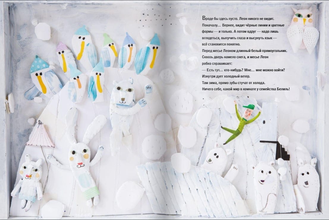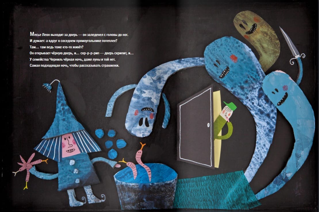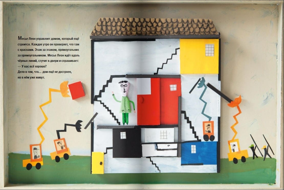 Месье Леон управляет домом, который ещё строится. Каждое утро он проверяет, что там с красками. Этаж за этажом, прямоугольник за прямоугольником. Месье Леон идёт вдоль чёрных линий, стучит в двери и спрашивает: — У вас всё хорошо? Дело в том, что… дом ещё не достроен, но в нём уже живут.