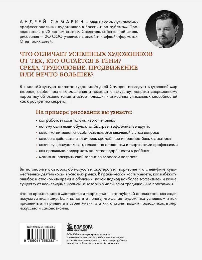 Андрей Самарин, российский художественный деятель, преподаватель и основатель студии рисования, разбирает мифы о врожденных способностях и показывает, что за успехом всегда стоят конкретные навыки, практика и систематический подход. С опорой на психологические исследования, истории из разных сфер и практические рекомендации книга объясняет, как формируются способности, как их развивать и почему одни добиваются результата, а другие так и остаются пребывать в иллюзиях.