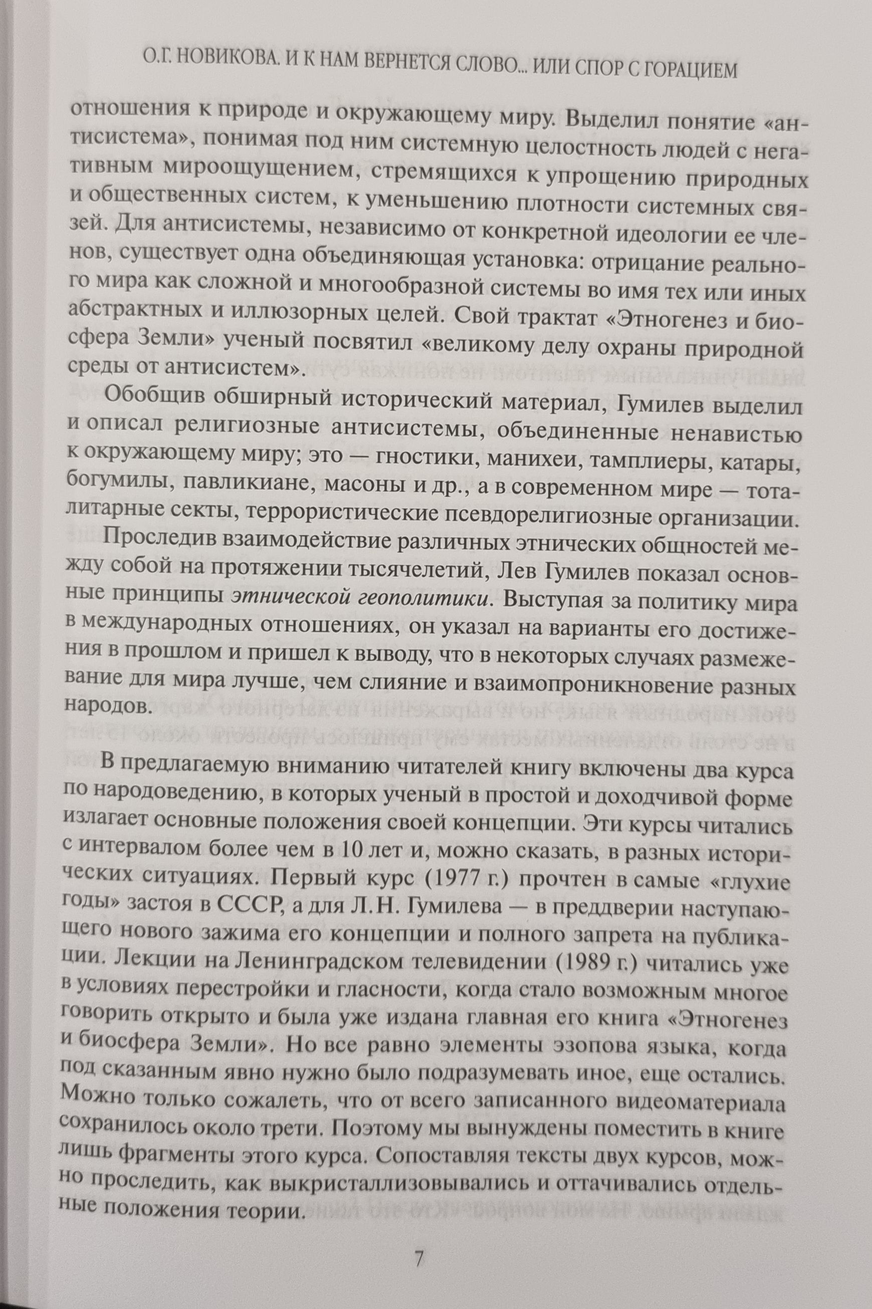 Выдающийся отечественный мыслитель Лев Николаевич Гумилев известен как автор пассионарной теории этногенеза. Введя понятие «пассионарность», он различал в нем противоположности: религиозные устремления и добродетели, жертвенность, ведущие к святости, и пороки, в частности — страстность, основанную на эгоизме. Ученый утверждал, что человек в своей деятельности руководствуется не идеями, а идеалами, отношением к окружающему миру. Он выдвинул принцип биполярности этносферы и применил его к религиоведению, сгруппировав религиозные системы по принципу отношения к природе и окружающему миру. Выделил понятие «антисистема», понимая под ним системную целостность людей с негативным мироощущением, стремящихся к упрощению природных и общественных систем, к уменьшению плотности системных связей. Уникальный курс лекций Льва Гумилева, издаваемый на основе аудиоархива ученого, дает представление о широком спектре его научных изысканий и оригинальных обобщений. Он не был кабинетным ученым, — он был великолепным лектором. Владея широким спектром нюансов русского языка и прекрасным знанием человеческой природы, мог научно, но при этом кратко и доходчиво изложить свою теорию для представителей любого социального слоя и возраста. Его научные лекции и семинары были общедоступны, чрезвычайно популярны в 1980-е гг. и проходили при переполненных залах.