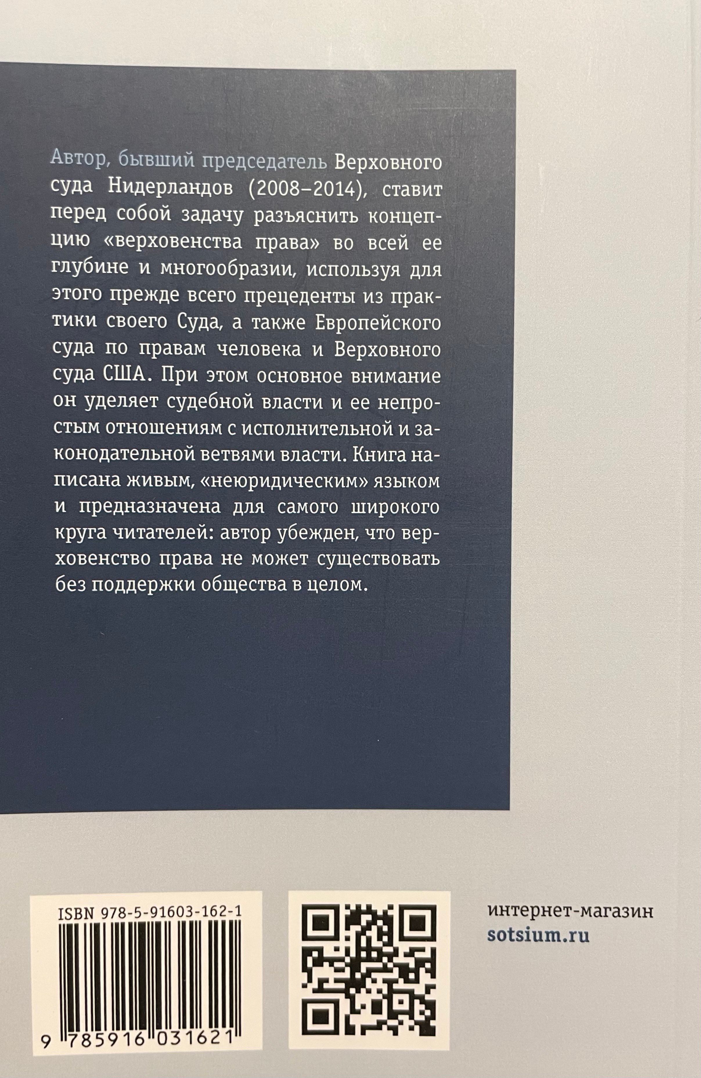 Автор, бывший председатель Верховного суда Нидерландов (2008–2014), ставит перед собой задачу разъяснить концепцию «верховенства права» во всей ее глубине и многообразии, используя для этого прежде всего прецеденты из практики своего Суда, а также Европейского суда по правам человека и Верховного суда США. При этом основное внимание он уделяет судебной власти и ее непростым отношениям с исполнительной и законодательной ветвями власти.