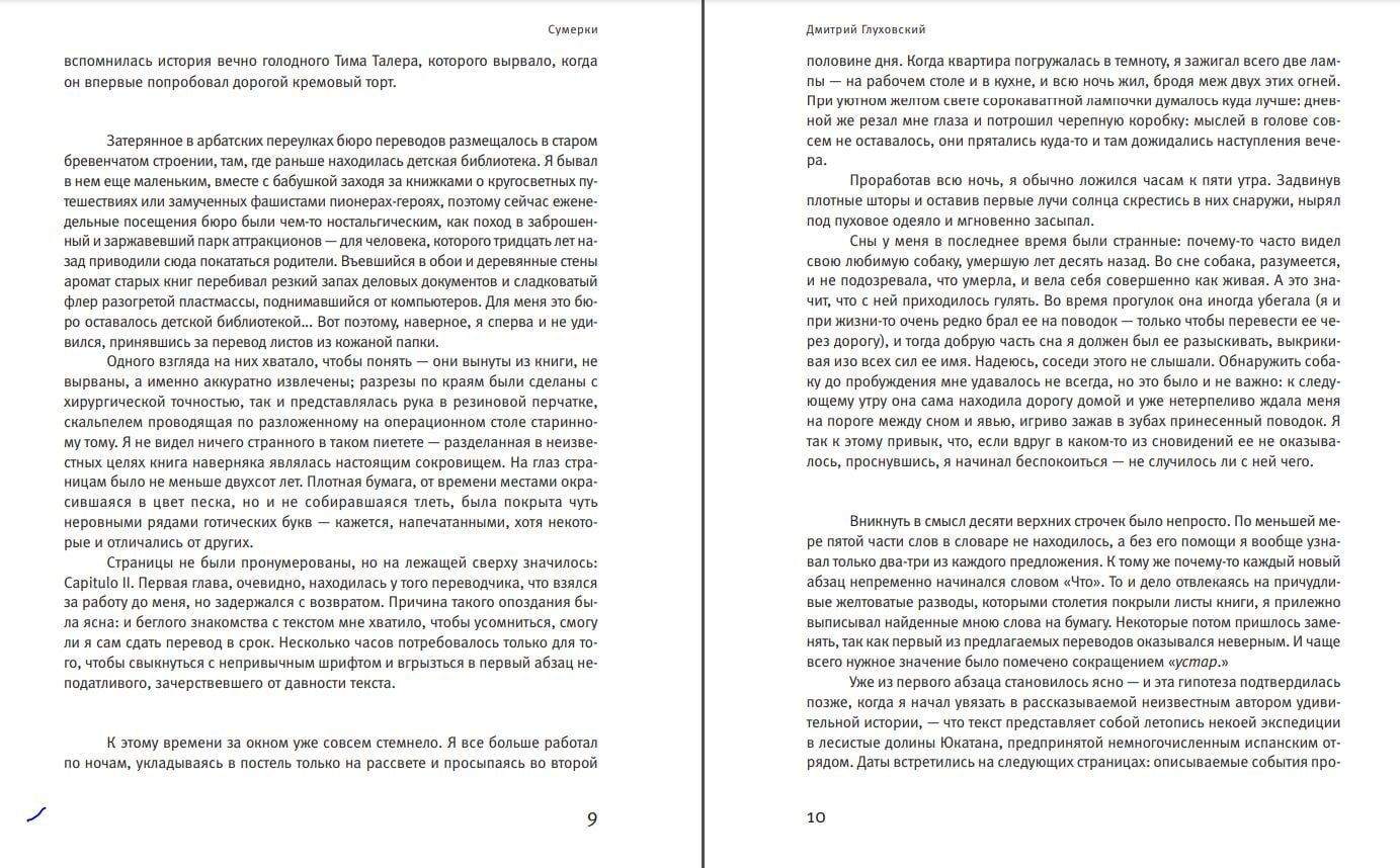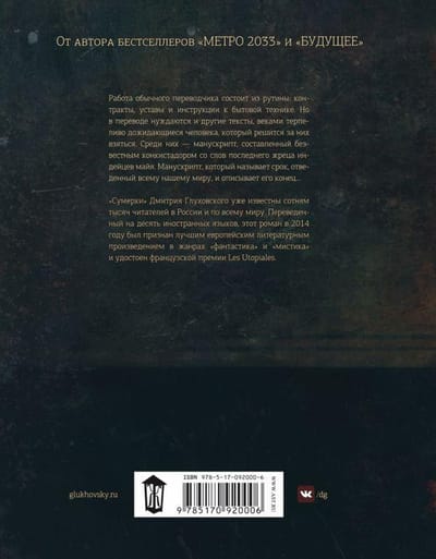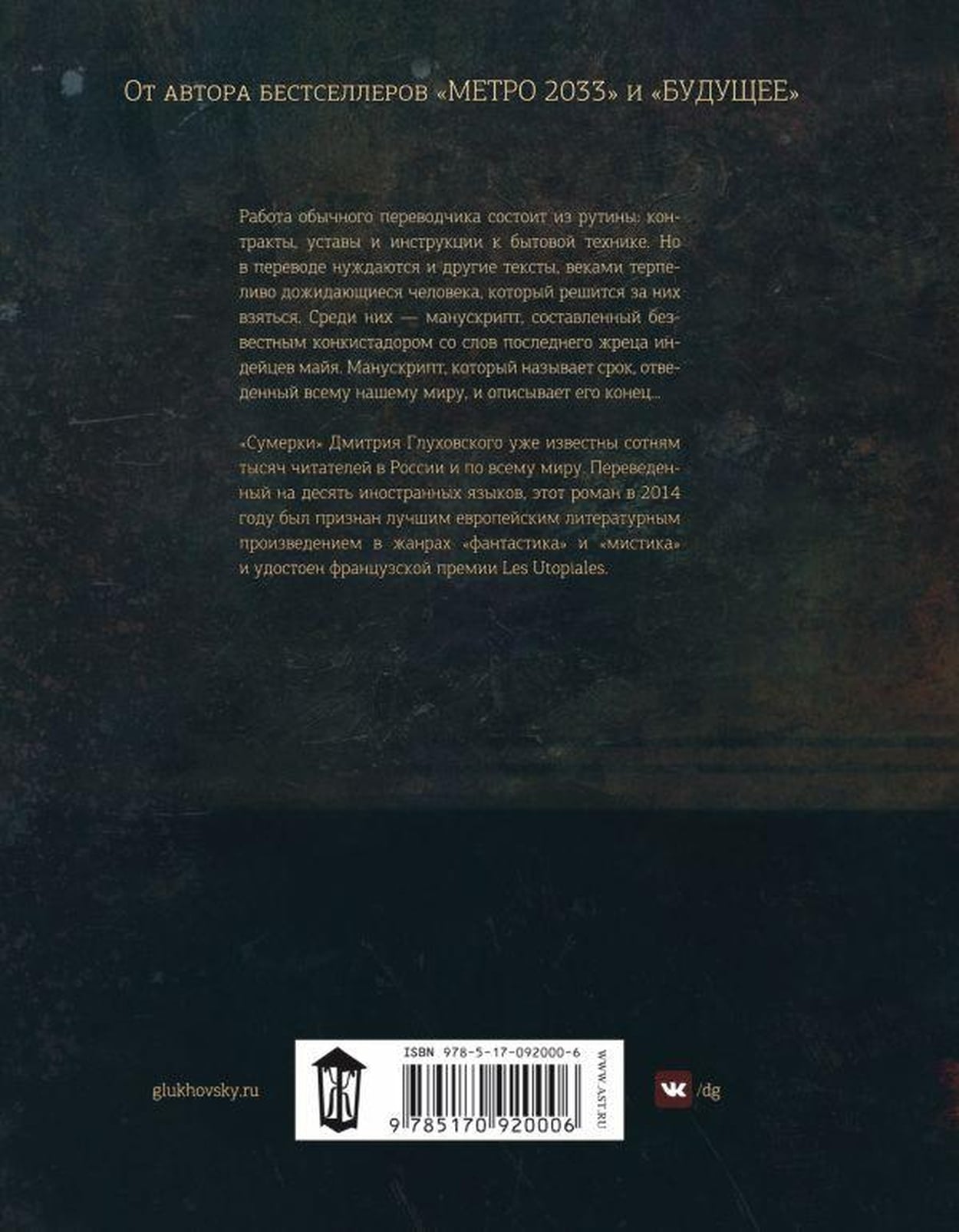 «Сумерки» Дмитрия Глуховского уже известный сотням тысяч читателей по всему миру. Переведенный на десять иностранных языков, этот роман в 2014 году был признан лучшим европейским литературным произведением в жанрах «фантастика» и «мистика» и удостоен французской премии Les Utopiales.