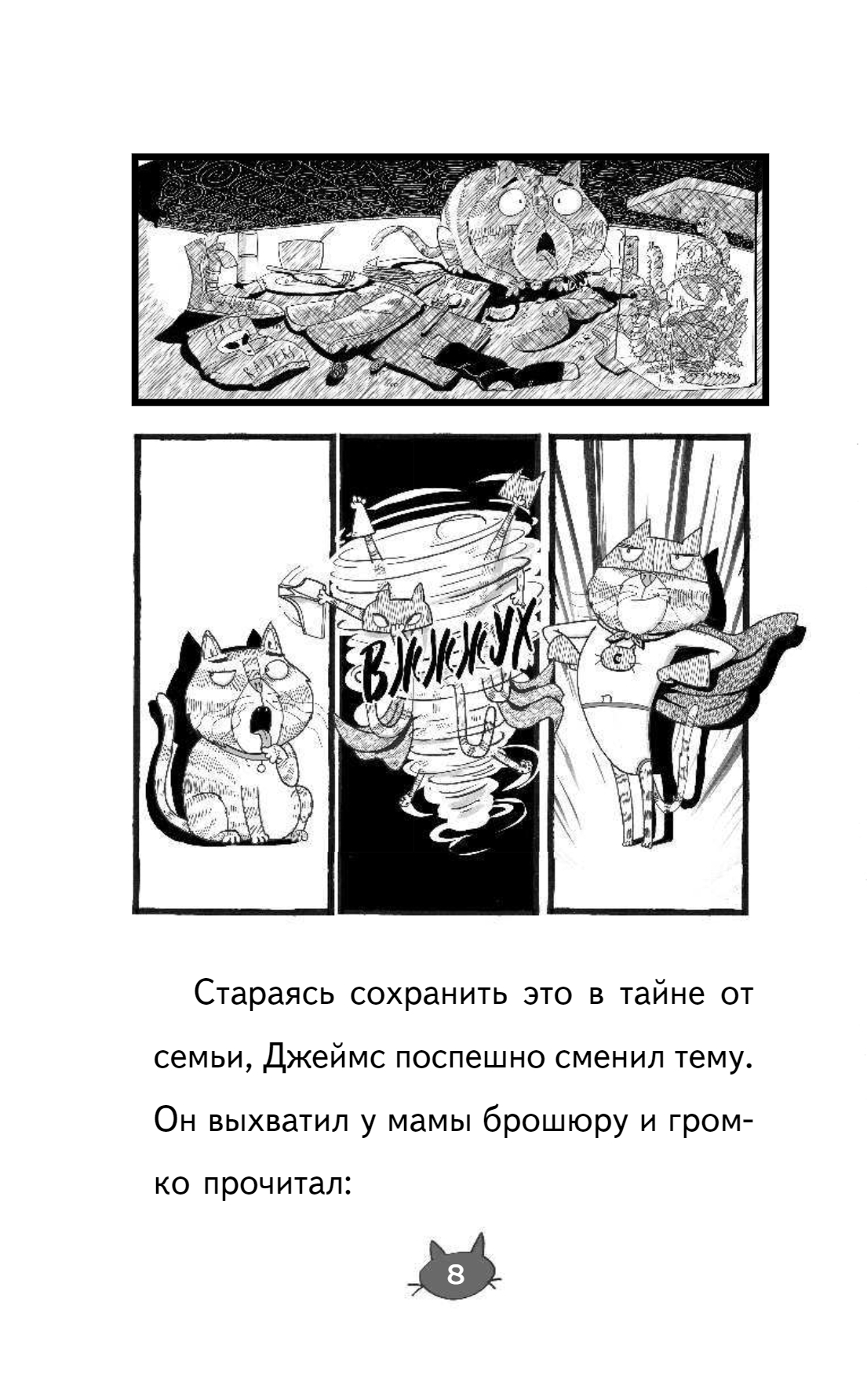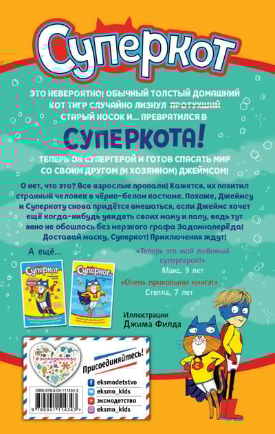 Когда Джеймс вместе с семьёй и Суперкотом, спрятанным в рюкзаке, отправился на новую ярмарку с аттракционами, он и не подозревал, чем это закончится. Все взрослые пропали! Точнее, их загипнотизировал и увёл за собой странный тип по имени Фамдор Рёнпадегаз. О нет! Похоже, это замаскированный Граф Задомнаперёд — их давний враг! Но зачем ему понадобились взрослые? И почему он привёл их всех на свой странный корабль? Джеймс и Суперкот непременно это выяснят и всех спасут! А как иначе, ведь они — настоящие супергерои!