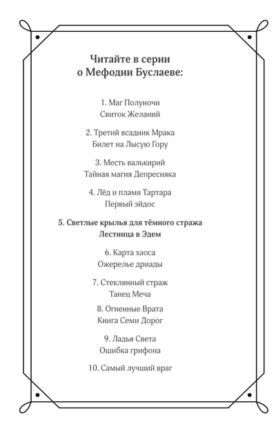 Одна книга — две истории знаменитого российского писателя Дмитрия Емца о приключениях «Мефодия Буслаева» — «Светлые крылья для тёмного стража» и «Лестница в Эдем»!