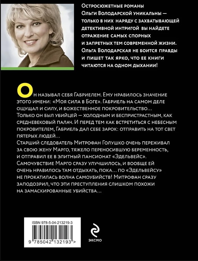 Старший следователь Митрофан Голушко очень переживал за свою жену Марго, тяжело переносившую беременность, и отправил ее в элитный пансионат «Эдельвейс». Самочувствие Марго сразу улучшилось, и вообще ей очень нравилось там отдыхать, пока… по «Эдельвейсу» не прокатилась волна самоубийств! Митрофан сразу заподозрил, что эти преступления слишком похожи на замаскированные убийства…