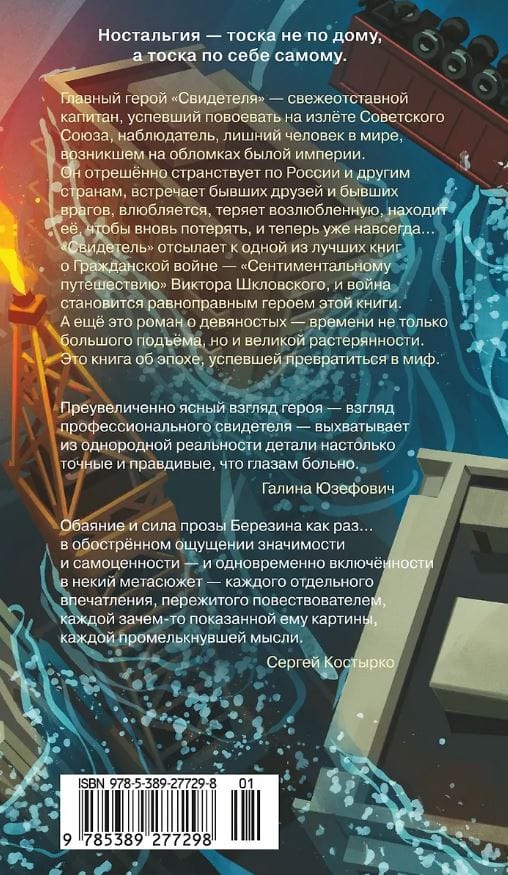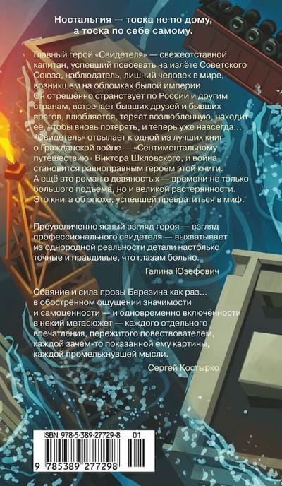 Главный герой «Свидетеля» — капитан, успевший повоевать на излёте Советского Союза, наблюдатель в мире, возникшем на обломках былой империи. Он отрешённо странствует по России и другим странам, встречает людей из прошлого, влюбляется, теряет возлюбленную, находит её, чтобы вновь потерять, и теперь уже навсегда… «Свидетель» отсылает к одной из лучших книг о Гражданской войне — «Сентиментальному путешествию» Виктора Шкловского, и война становится равноправным героем этой книги. А ещё это роман о девяностых — времени не только большого подъёма, но и великой растерянности. Это книга об эпохе, успевшей превратиться в миф.