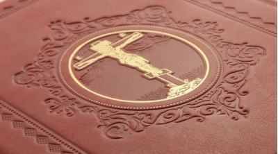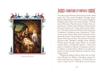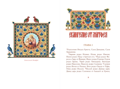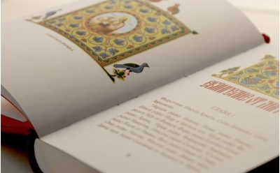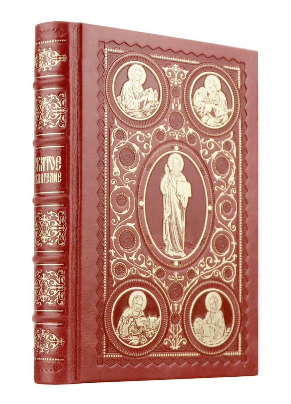 Коллекционное издание Святого Евангелия со множеством иллюстраций. Книга отпечатана на гладкой белой бумаге, сшита вручную, украшена византийскими орнаментами. Переплет из гладкой алой кожи изготовлен по традиционной технологии XIX века и украшен изящным тиснением. Форзацы из хлопковой бумаги, обрез обработан вручную, каптал и ляссе — шелковые. Сертификат, подтверждающий уникальность коллекционного переплета, вложен в каждый экземпляр и пронумерован вручную.
