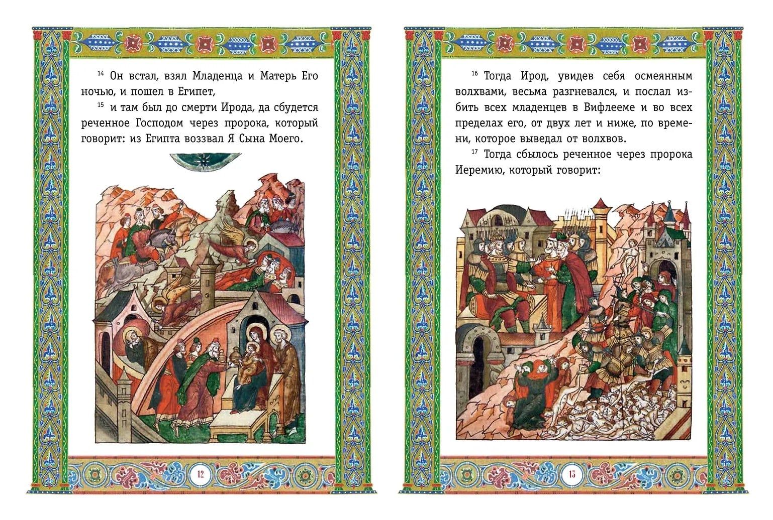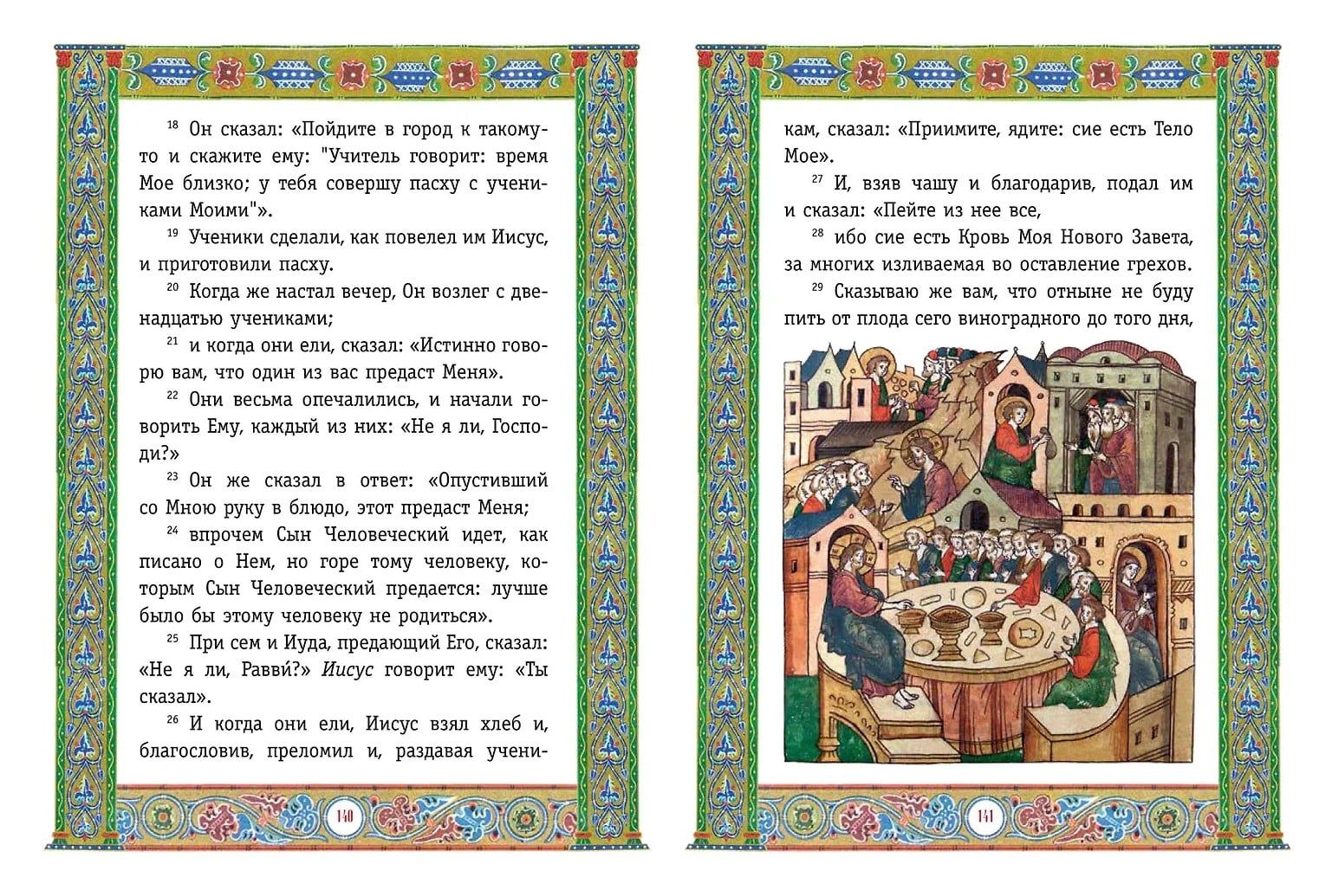 Четыре канонические книги Евангелия апостолов Матфея, Марка, Луки и Иоанна даны в последней редакции синодального перевода на современный русский язык, с учетом норм современной орфографии. Перевод предоставлен Издательством Московской Патриархии. Его возможно читать неподготовленному человеку, не знакомому ранее с этой великой Книгой. Текст набран крупным шрифтом, разбитым на церковные зачала.