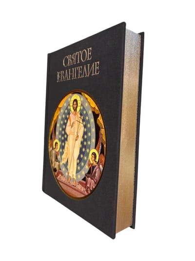 Украшают издание богатый бархатный переплет, трехсторонний серебряный обрез и лента ляссе. В оформлении обложки использованы серебряная и золотая фольга, а также цветное изображение Иисуса Христа и ангелов.