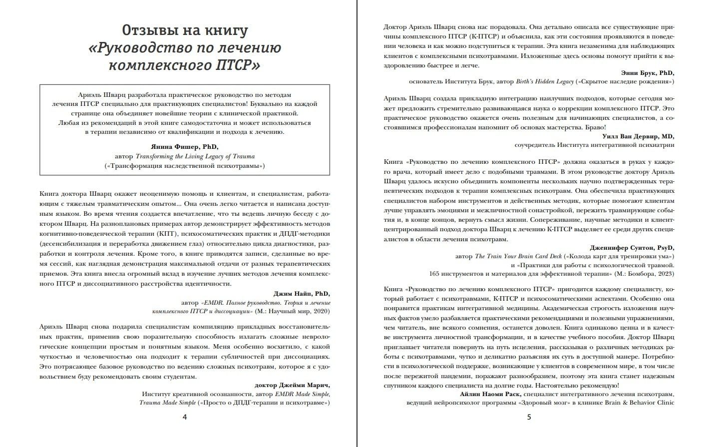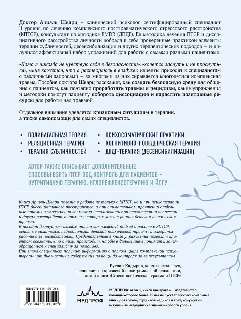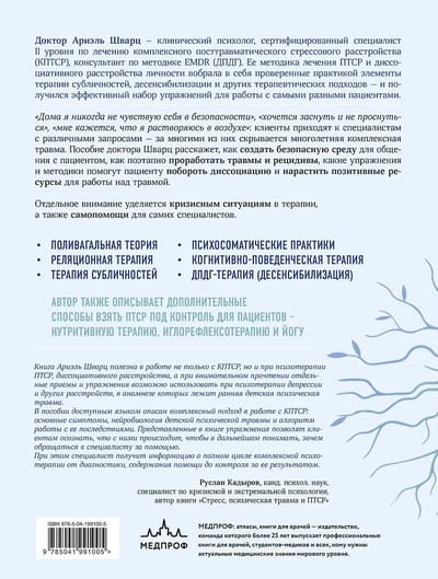В своем практическом руководстве по работе с комплексным посттравматическим расстройством доктор Ариэль Шварц, клинический психолог и специалист по К-ПТСР, излагает разностороннюю методику терапии случаев К-ПТСР. Изложенная в форме понятных терапевтических упражнений-опросников, теоретических обоснований и случаев из практики, методика доктора Шварц станет полезным инструментом в арсенале разных специалистов, работающих с психотравмами: от психологов до психиатров. Различные подходы призваны переключить внимание пациента с внутренних переживаний и ретроспективы на ощущения собственного тела и его возможностей на настоящий момент.