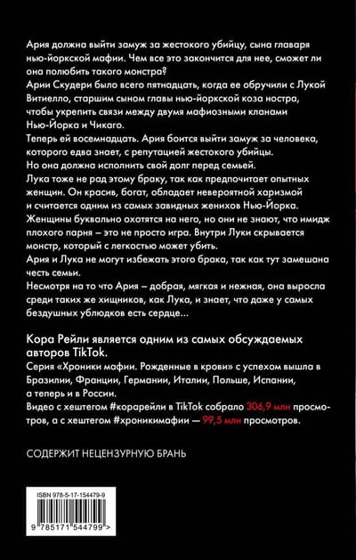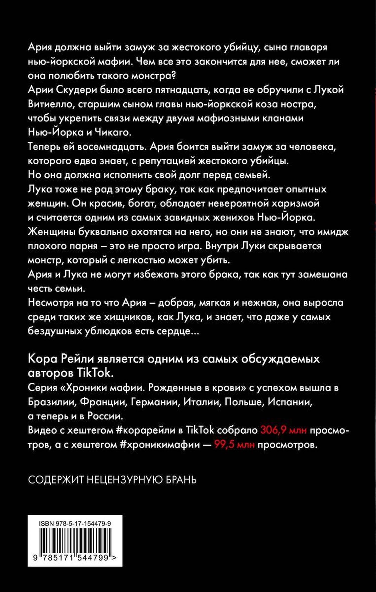Ария должна выйти замуж за жестокого убийцу, главаря Ньй-Йоркской мафии. Чем все это закончится для нее, сможет ли она полюбить такого монстра? Арии Скудери было всего пятнадцать, когда ее обручили с Лукой Витиелло, старшим сыном главы нью-йоркской «Коза ностра», чтобы укрепить связи между двумя мафиозными кланами Нью-Йорка и Чикаго.
