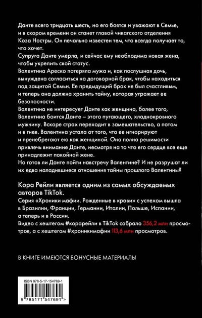 Данте всего тридцать шесть, но его боятся и уважают в Семье, и в скором времени он станет главой чикагской отделения Коза Ностры. Он печально известен тем, что всегда получает то, что хочет. Супруга Данте умерла, и сейчас ему необходима новая жена, чтобы укрепить свой статус.Валентина Ареско потеряла мужа и как послушная дочь вынуждена согласиться на договорной брак, чтобы находиться под защитой Семьи. Ее предыдущий брак не был счастливым и теперь она вынуждена хранить тайну, которая угрожает ее безопасности. Валентина не интересует Данте как женщина, более того, Валентина боится Данте – этого пугающего, хладнокровного мужчину. Вскоре страх переходит в замешательство, а потом и в гнев. Валентина устала от того, что ее игнорируют и пренебрегают как женщиной. Она полна решимости привлечь внимание Данте, несмотря на то, что его сердце все еще принадлежит покойной жене. Но готов ли Данте пойти на встречу Валентине? И не разрушат ли их едва наладившиеся отношения тайны прошлого Валентины?