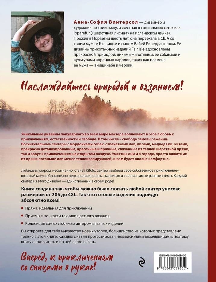 Все поклонники северного узорного вязания будут в восторге от ее узоров на уютном трикотаже — на кокетке и рукавах свитеров оживают орнаменты и животные: лисы, дельфины, альпаки, волки, следы и мордочки любимых собак и все, что подсказала автору ее богатая фантазия!