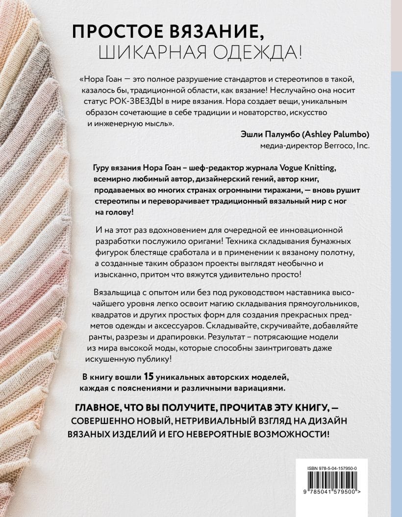 Сенсационная премьера для российских вязальщиц! Одновременно с американскими читателями на русском новое революционное пособие от знаменитой Норы Гоан, которая прославилась в нашей стране и во всем мире своим нетривиальным подходом к искусству создания вязаной одежды. На этот раз она совершает свои открытия не на основе узоров. Предметом ее экспериментов стало... оригами! Уникальные модели рождаются путем сложения, скручивания, драпировки простого вязаного полотна, и поверьте, до такого не додумался еще никто в мире! Удивительные формы, роскошные и совершенно необычные дизайны ее моделей, красота и логика ее идей покоряют с первого взгляда. Оцените и вы 15 авторских моделей, которые вяжутся очень просто по идеально проработанным инструкциям Норы Гоан. И одновременно постигайте секреты и фишки уникального вязаного оригами.