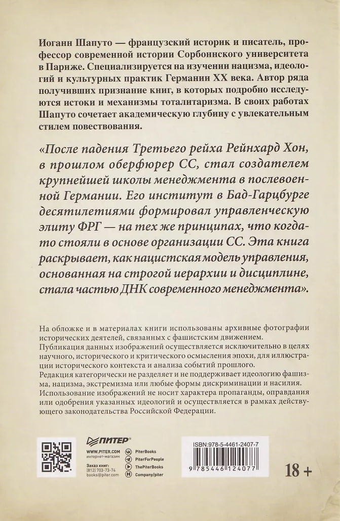 После падения Третьего рейха Рейнхард Хон, в прошлом оберфюрер СС, стал создателем крупнейшей школы менеджмента в послевоенной Германии. Его институт в Бад-Гарцбурге десятилетиями формировал управленческую элиту ФРГ — на тех же принципах, что когда-то стояли в основе организации СС. Эта книга раскрывает, как нацистская модель управления, основанная на строгой иерархии и дисциплине, стала частью ДНК современного менеджмента.