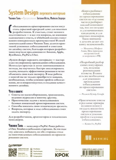 Собеседования по проектированию систем могут стать серьезной преградой даже для опытных разработчиков. К счастью, стоит немного подготовиться — и все эти вопросы, не имеющие однозначного ответа, и whiteboard-сессии станут вашим конкурентным преимуществом! В своей замечательной книге Чжиюн Тань делится практикой успешных собеседований и советами по дизайну систем, благодаря которым разработчики получали предложения от Amazon, Apple, ByteDance, PayPal и Uber.