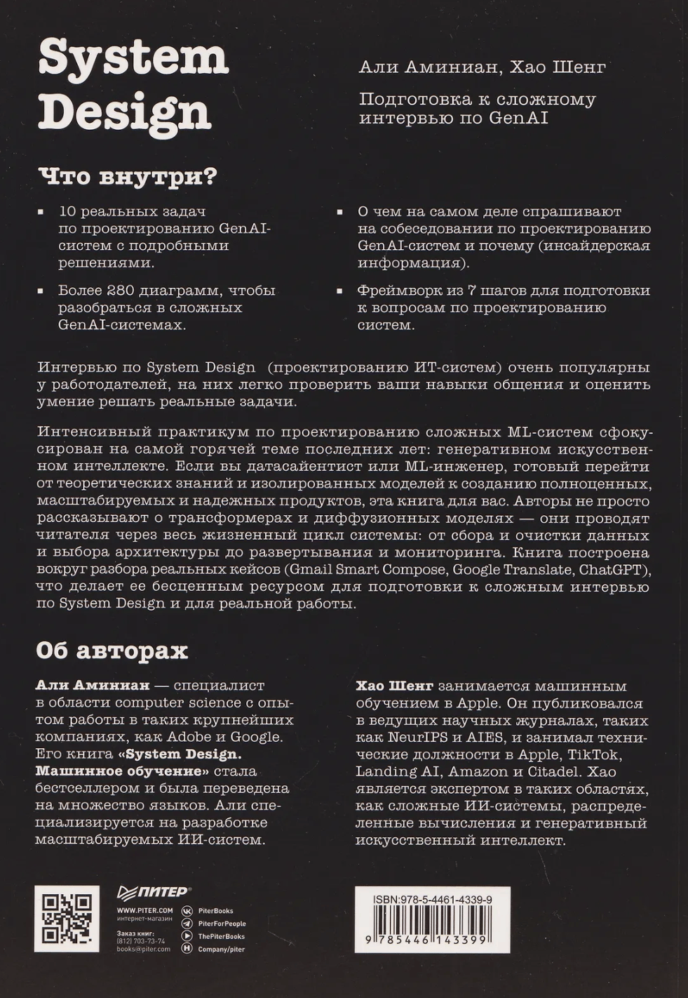 Интенсивный практикум по проектированию сложных ML-систем сфокусирован на самой горячей теме последних лет: генеративном искусственном интеллекте. Если вы датасайентист или ML-инженер, готовый перейти от теоретических знаний и изолированных моделей к созданию полноценных, масштабируемых и надежных продуктов, эта книга для вас. Авторы не просто рассказывают о трансформерах и диффузионных моделях — они проводят читателя через весь жизненный цикл системы: от сбора и очистки данных и выбора архитектуры до развертывания и мониторинга. Книга построена вокруг разбора реальных кейсов (Gmail Smart Compose, Google Translate, ChatGPT), что делает её бесценным ресурсом для подготовки к сложным интервью по System Design и для реальной работы.