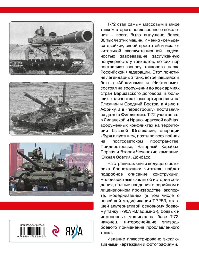 Т-72 стал самым массовым в мире танком второго послевоенного поколения – всего было выпущено более 30 тысяч этих машин. Именно «семьдесят двойки», своей простотой и исключительной эксплуатационной надежностью завоевавшие заслуженную популярность у танкистов, до сих пор составляют основу танкового парка Российской Федерации. Этот поистине легендарный танк, встречавшийся в бою с «Абрамсами» и «Чифтенами», состоял на вооружении во всех армиях стран Варшавского договора, в больших количествах экспортировался на Ближний и Средний Восток, в Азию и Африку, а в «перестройку» поставлялся даже в Финляндию. Т-72 участвовал в Ливанской и Ирано-иракской войнах, вооруженных конфликтах на территории бывшей Югославии, операции «Буря в пустыне», почти во всех войнах на постсоветском пространстве: Приднестровье, Нагорный Карабах, Первая и Вторая Чеченские кампании, Южная Осетия, Донбасс. На страницах книги ведущего историка бронетехники читатель найдет подробное описание конструкции, малоизвестные факты об истории создания, полные сведения о серийном и лицензионном производстве, экспорте, модернизациях (в том числе о новейшей модификации Т-72Б3, ставшей альтернативой основному боевому танку Т-90А «Владимир»), боевых и инженерных машинах на базе Т-72, наконец, интереснейшие эпизоды боевого применения прославленного танка. Издание иллюстрировано эксклюзивными чертежами и фотографиями.