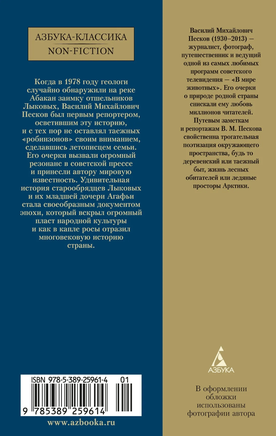 Когда в 1978 году геологи случайно обнаружили на реке Абакан заимку отшельников Лыковых, Василий Михайлович Песков был первым репортером, осветившим эту историю, и с тех пор не оставлял таежных «робинзонов» своим вниманием, сделавшись летописцем семьи. Его очерки вызвали огромный резонанс в советской прессе и принесли автору мировую известность. Удивительная история старообрядцев Лыковых и их младшей дочери Агафьи стала своеобразным документом эпохи, который вскрыл огромный пласт народной истории страны.