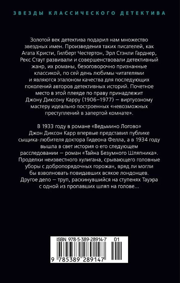 В 1933 году в романе «Ведьмино Логово» Джон Диксон Карр впервые представил публике сыщика-любителя доктора Гидеона Фелла, а в 1934 году вышла в свет история о его следующем расследовании — роман «Тайна Безумного Шляпника». Проделки неизвестного хулигана, срывающего головные уборы с добропорядочных горожан, вряд ли могли бы взволновать повидавших всякое лондонцев. Другое дело — труп, раскинувшийся на ступенях Тауэра с одной из пропавших шляп на голове...