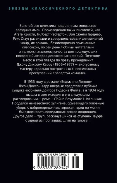 Золотой век детектива подарил нам множество звездных имен. Произведения таких писателей, как Агата Кристи, Гилберт Честертон, Эрл Стэнли Гарднер, Рекс Стаут развивали и совершенствовали детективный жанр, их романы, безоговорочно признанные классикой, по сей день любимы читателями и являются эталоном качества для последующих поколений авторов детективных историй. Почетное место в этой плеяде по праву принадлежит Джону Диксону Карру (1906–1977) — виртуозному мастеру идеально построенных «невозможных преступлений в запертой комнате».
