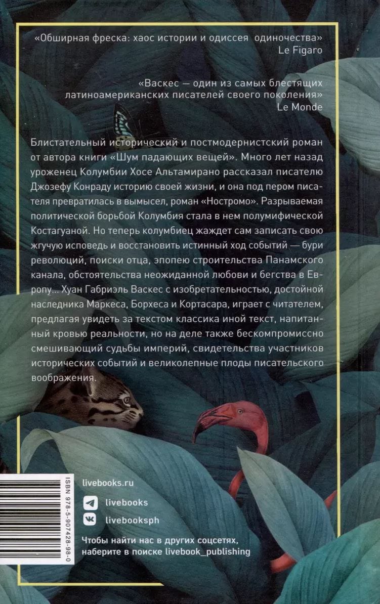 Блистательный исторический и постмодернистский роман от автора книги «Шум падающих вещей». Много лет назад уроженец Колумбии Хосе Альтамирано рассказал писателю Джозефу Конраду историю своей жизни, и она под пером писателя превратилась в вымысел, роман «Ностромо». Разрываемая политической борьбой Колумбия стала в нем полумифической Костагуаной. Но теперь колумбиец жаждет сам записать свою жгучую исповедь и восстановить истинный ход событий ‒ бури революций, поиски отца, эпопею строительства Панамского канала, обстоятельства неожиданной любови и бегства в Европу…
