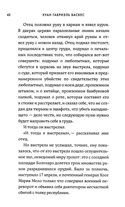 Хуан Габриэль Васкес с изобретательностью, достойной наследника Маркеса, Борхеса и Кортасара, играет с читателем, предлагая увидеть за текстом классика иной текст, напитанный кровью реальности, но на деле также бескомпромиссно смешивающий судьбы империй, свидетельства участников исторических событий и великолепные плоды писательского воображения.