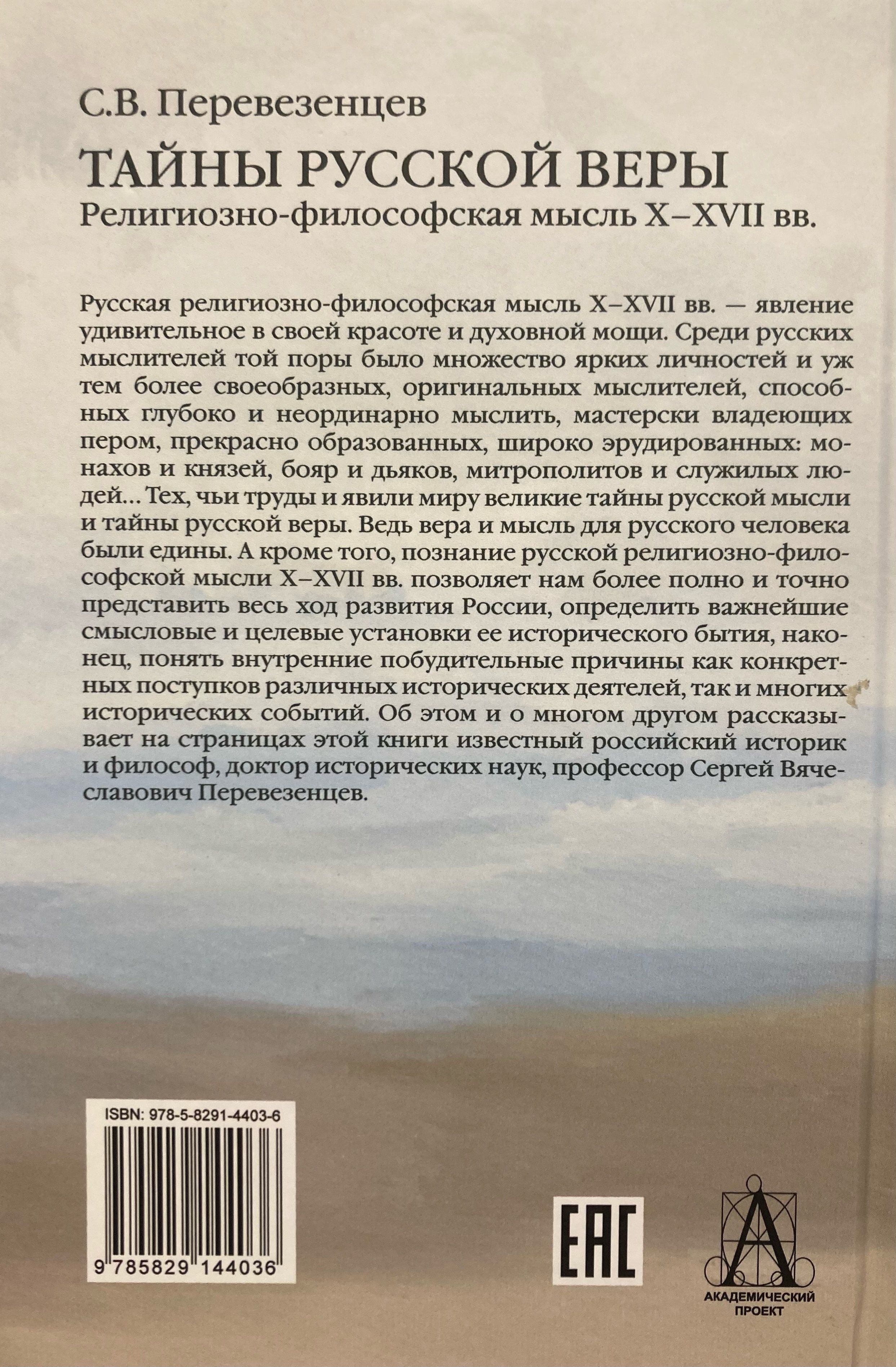 Русская религиозно-философская мысль X-XVII вв. - явление удивительное в своей красоте и духовной мощи. Среди русских мыслителей той поры было множество ярких личностей и уж тем более своеобразных, оригинальных мыслителей, способных глубоко и неординарно мыслить, мастерски владеющих пером, прекрасно образованных, широко эрудированных: монахов и князей, бояр и дьяков, митрополитов и служилых людей... Тех, чьи труды и явили миру великие тайны русской мысли и тайны русской веры. Ведь вера и мысль для русского человека были едины. А кроме того, познание русской религиозно-философской мысли X-XVII вв. позволяет нам более полно и точно представить весь ход развития России, определить важнейшие смысловые и целевые установки се исторического бытия, наконец, понять внутренние побудительные причины как конкретных поступков различных исторических деятелей, так и многих исторических событий. Об этом и о многом другом рассказывает на страницах этой книги известный российский историк и философ, доктор исторических наук, профессор Сергей Вячеславович Перевезенцев.