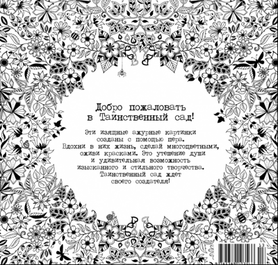 Раскраски для взрослых завоевали мир. Волшебное, вдохновляющее путешествие от дневных забот в мир творчества. Работы Джоанны Бэсфорд случайно нашла редактор английского издательства LAURENCE KING и обратила внимания на восторженные отзывы в блоге художницы. Так родилась идея создания оригинальной раскраски для взрослых. Выпустив книгу и поверив в успех, издатель не ошибся. За несколько месяцев «Таинственный сад» был продан тиражом более 1 000 000 экз. Настоящим открытием и синонимом успеха стал новый тренд, который определил и новый вид книжной продукции – раскраски для взрослых. Вместе с популярным увлечением, который не случайно называют арт-терапия, мир получил и королеву этого направления – Джоанну Бэсфорд. Добро пожаловать в Таинственный сад! Эти изящные ажурные картинки созданы с помощью пера. Вдохни в них жизнь, сделай многоцветными, оживи красками. Это утешение души и удивительная возможность изысканного и стильного творчества. Таинственный сад ждет своего создателя!
