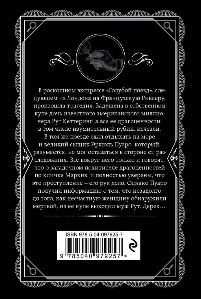 В роскошном экспрессе "Голубой поезд", следующем из Лондона на Французскую Ривьеру, произошла трагедия. Задушена в собственном купе дочь известного американского миллионера Рут Кеттеринг, а все ее драгоценности, в том числе изумительный рубин, исчезли. В том же поезде ехал отдыхать на море и великий сыщик Эркюль Пуаро, который, разумеется, не мог оставаться в стороне от расследования. Все вокруг него только и говорят, что о загадочном похитителе драгоценностей по кличке Маркиз, и полностью уверены, что это преступление – его рук дело. Однако Пуаро получил информацию о том, что незадолго до того, как несчастную женщину обнаружили мертвой, из ее купе выходил муж Рут, Дерек…