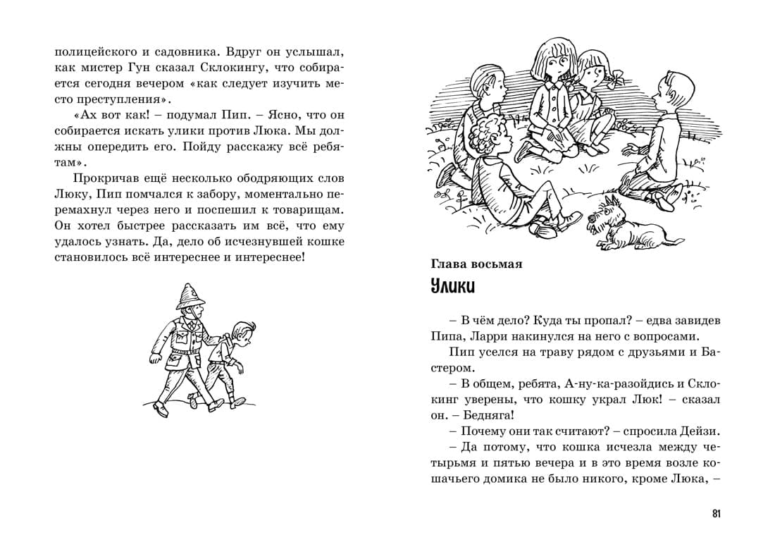 Пять юных сыщиков снова собираются вместе на летних каникулах. В этот раз они расследуют таинственное исчезновение дорогой сиамской кошки – питомицы леди Кэндлинг, новой соседки Пипа и Бетси. Полицейский А-ну-ка-разойдись и сварливый садовник мистер Склокинг уже готовы обвинить в краже помощника садовника Люка, но сыщики отказываются верить, что этот добродушный паренёк – вор. Кто же тогда украл кошку?