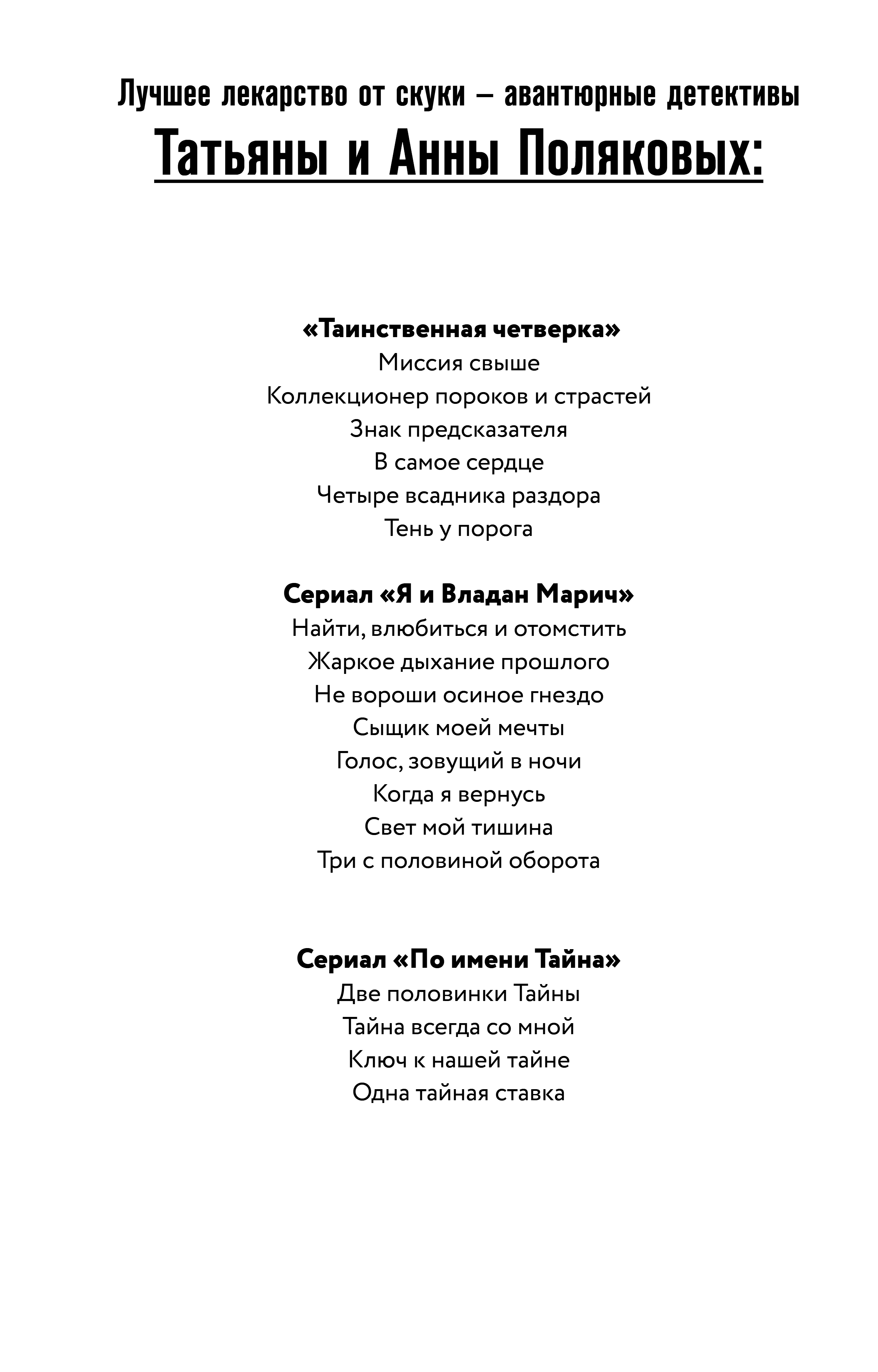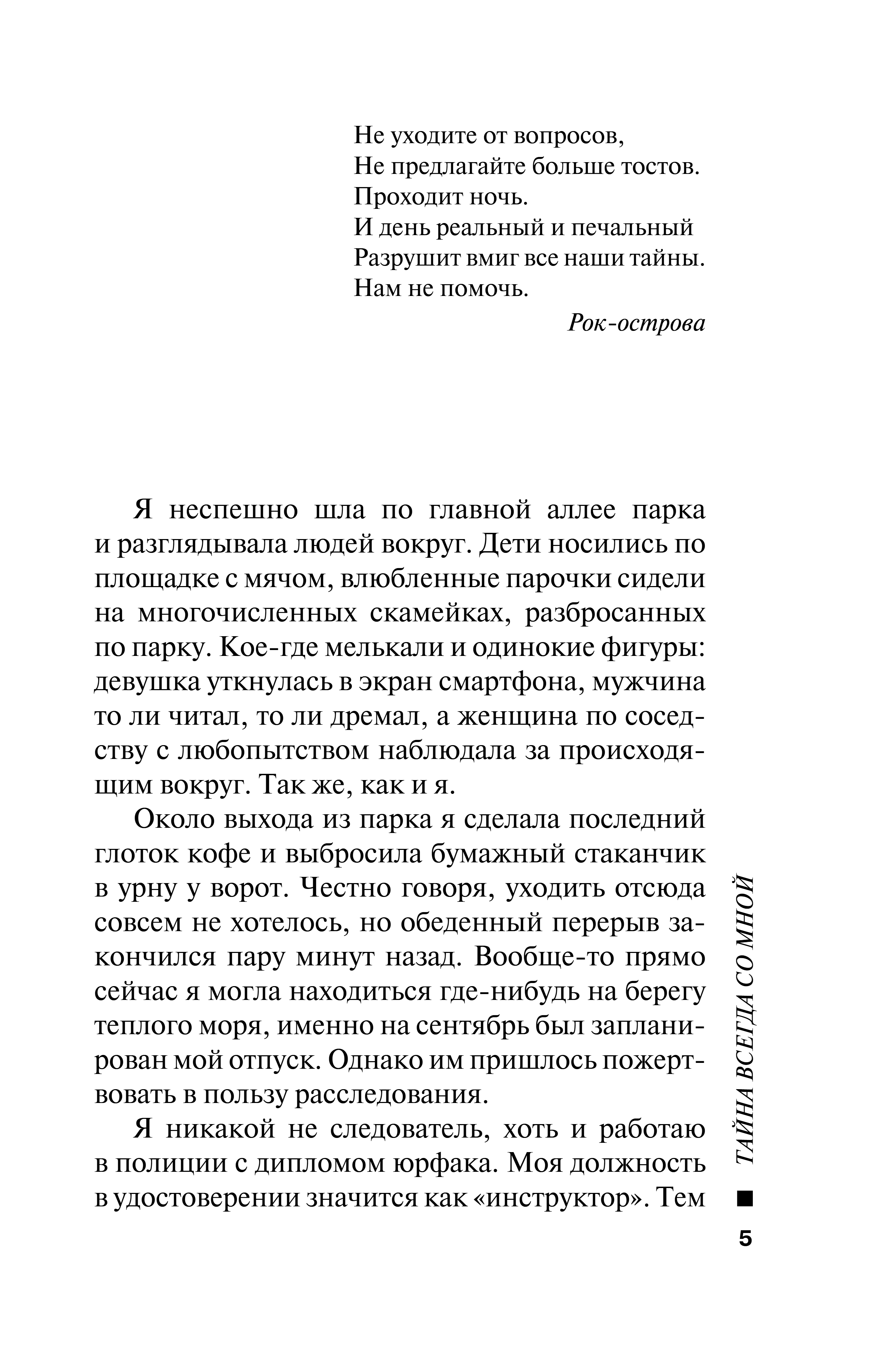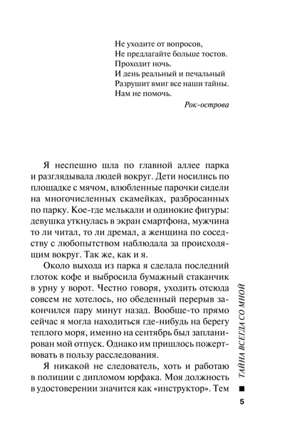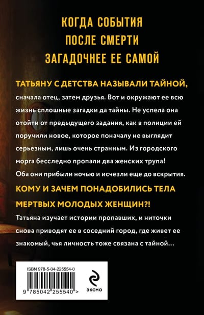 Татьяну с детства называли Тайной, сначала отец, затем друзья. Вот и окружают ее всю жизнь сплошные загадки да тайны. Не успела она отойти от предыдущего задания, как в полиции ей поручили новое, которое поначалу не выглядит серьезным, лишь очень странным. Из городского морга бесследно пропали два женских трупа. Оба они прибыли ночью и исчезли еще до вскрытия. Кому и зачем понадобились тела мертвых молодых женщин? Татьяна изучает истории пропавших, и ниточки снова приводят ее в соседний город, где живет ее знакомый, чья личность тоже связана с тайной…