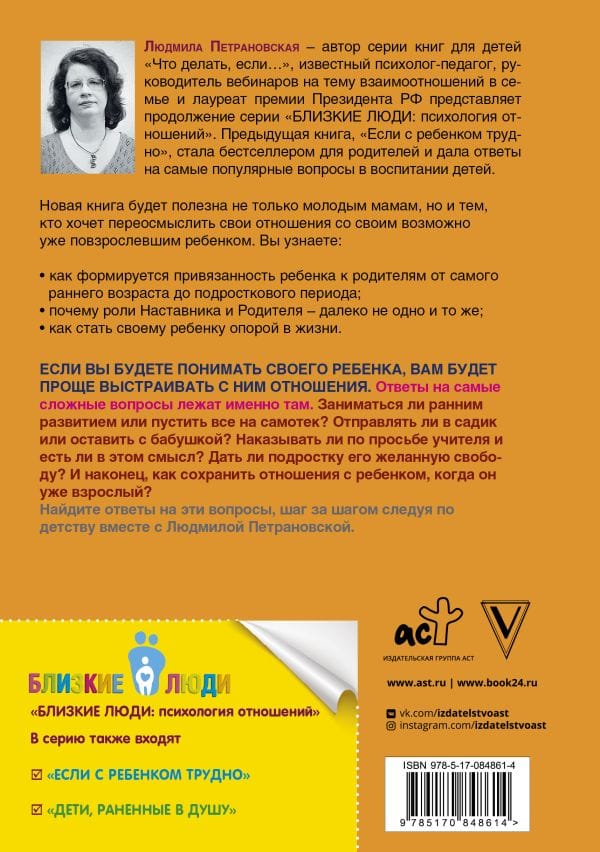 "Все мы родом из детства", – писал один известный французский писатель и летчик. Однако, прежде чем достичь самостоятельности, мы едва ли можем обойтись без взрослых. В своей новой книге Людмила Петрановская, основываясь на научной теории привязанности, легко и доступно рассказывает о роли родителей на пути к взрослению: "Как зависимость и беспомощность превращаются в зрелость, как наши любовь и забота год за годом формируют в ребенке тайную опору, на которой, как на стержне, держится его личность?" Прочитав эту книгу, вы не только сможете увидеть, что на самом деле стоит за детскими "капризами", "избалованностью", "агрессией", "вредным характером", но и понять, чем помочь своему ребенку, чтобы он рос и развивался не тратя силы на борьбу за вашу любовь.