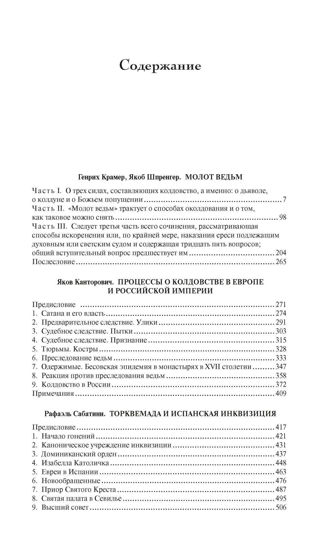Сборник содержит три культовые работы, посвященные этим и другим вопросам истории охоты на ведьм: «Молот ведьм» Г. Крамера и Я. Шпренгера, «Процессы о колдовстве в Европе и Российской империи» Я. Канторовича и «Торквемада и испанская инквизиция» Р. Сабатини.